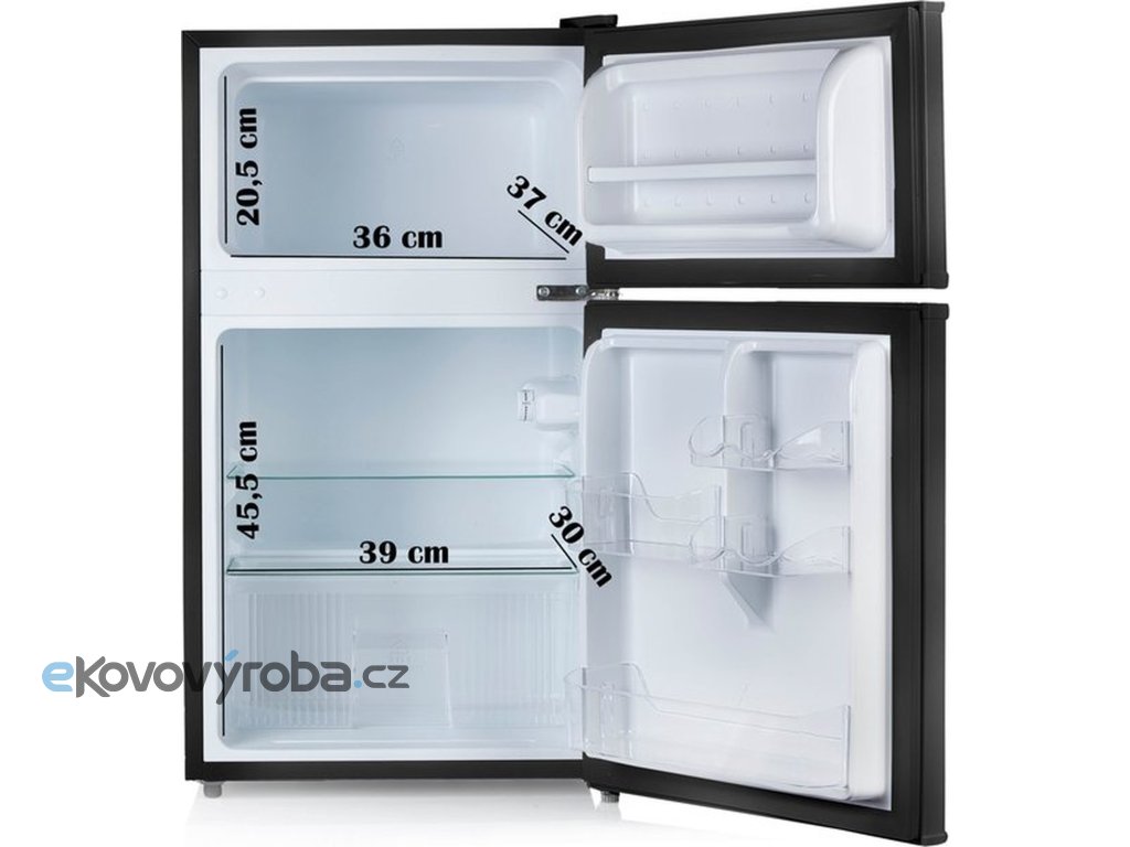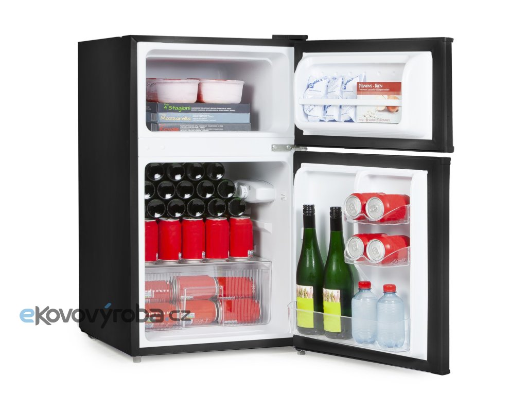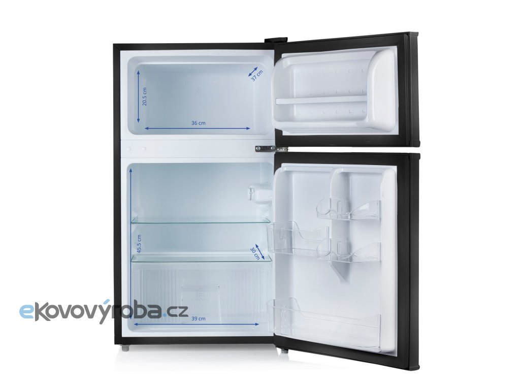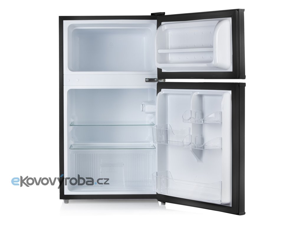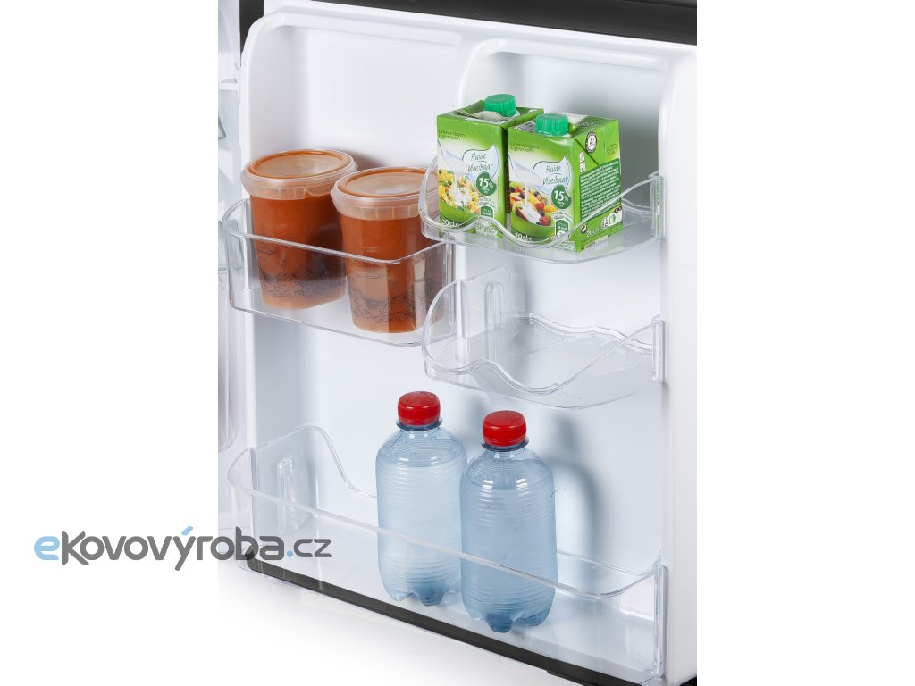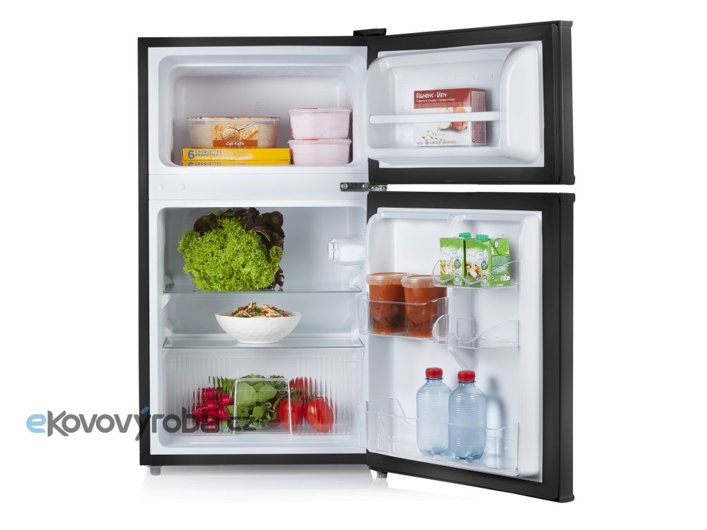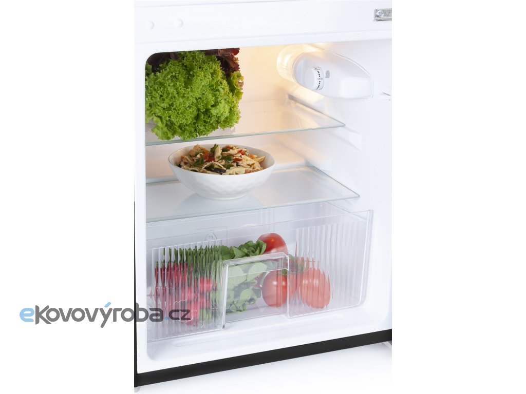 Kompaktní mini lednice v černé barvě s dostatečně velkým objemem chladničky i mrazáku pro použití například v ubytováních pro studenty, nebo do letní kuchyně, přístřešků, či pokojů pro hosty a všude tam kde není potřeba velké lednice a mrazáku. Svou výškou 85 cm se lednice pohodlně vejde do většiny kuchyní i jako částečná vestavba a panty dveří lze snadno stranově přizpůsobit. Vnitřní prostor lednice je rozdělený skleněnou policí, kterou lze vyjmout a ve dveřích lednice můžeme najít několik praktických přihrádek na nápoje, sklenice, plechovky apod. Všechny přihrádky lze snadno vyjmout a změnit tak vnitřní uspořádání dle potřeby. Možnost lepšího uspořádání potravin v mrazáku pak umožňuje přihrádka ve dvířkách mrazáku do které lze umístit například potraviny v obalu o velikosti až 31x5x14 cm.