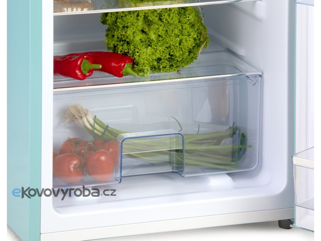 Kompaktní retro lednice v pastelově tyrkysové barvě s výraznými kovovými madly s chromovou úpravou prozáří interiér vašeho bytu a dodá mu nádech výjimečnosti. Lednici s menším mrazákem nahoře oceníte nejen pokud zpracováváte zejména čerstvé suroviny, ale také kvůli její nižší spotřebě.