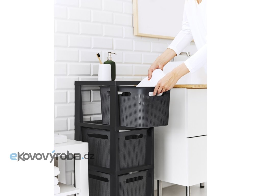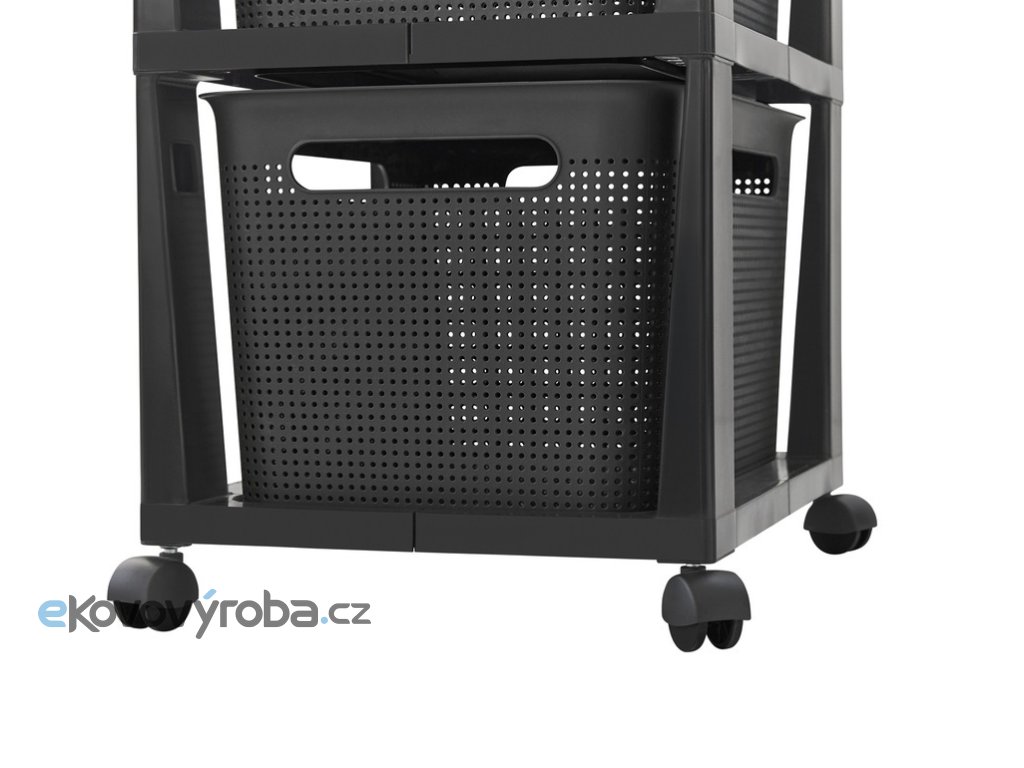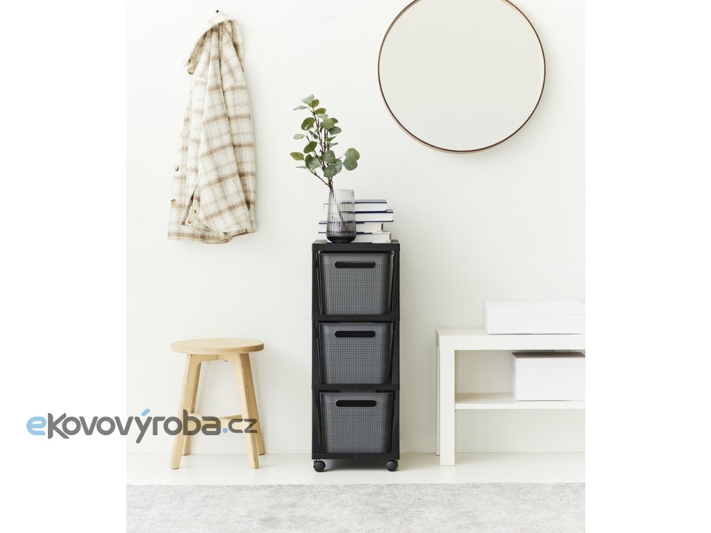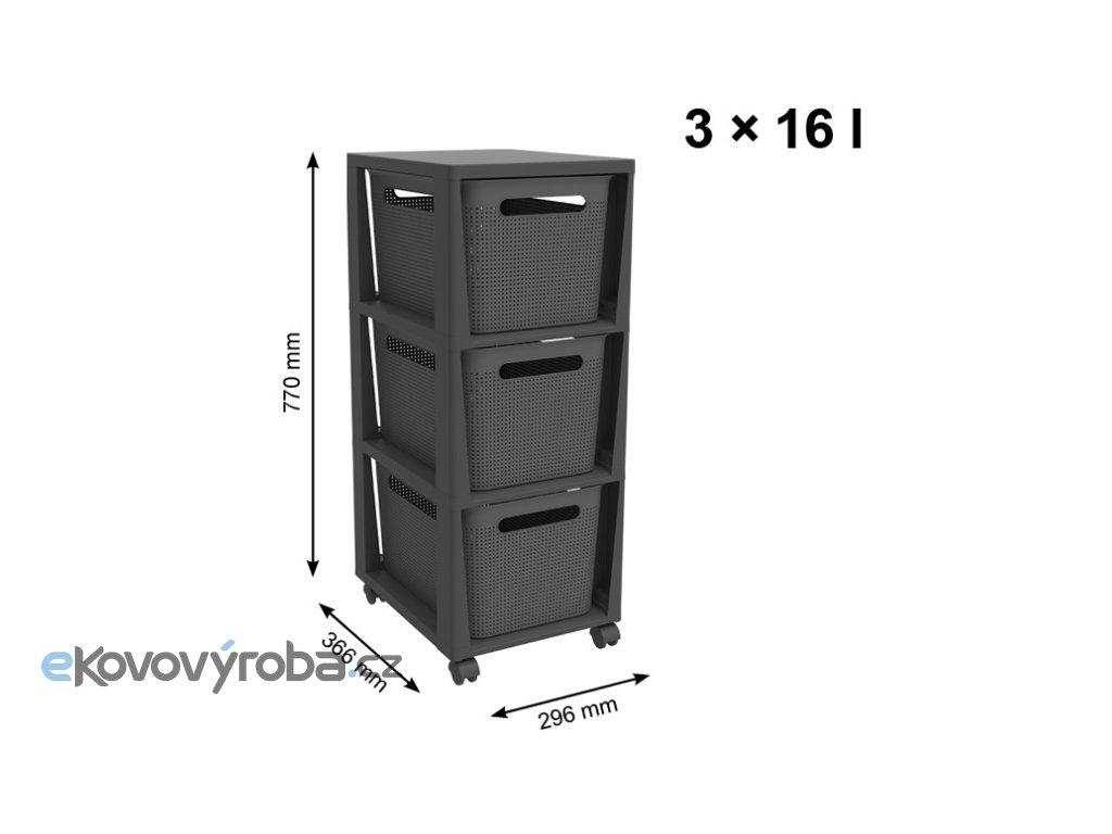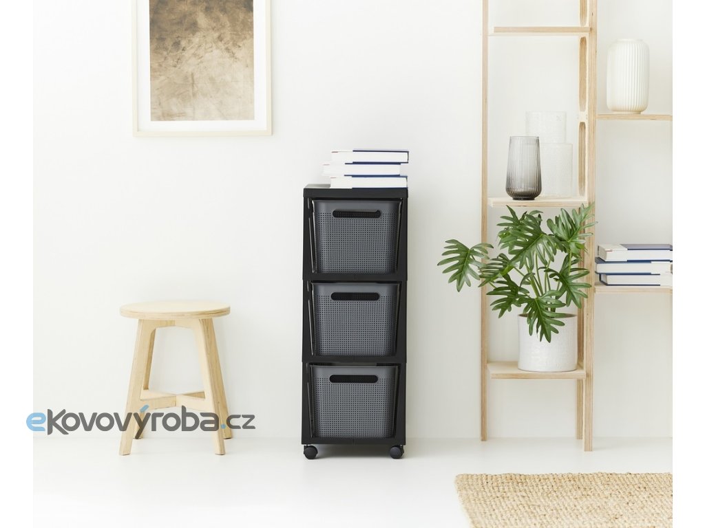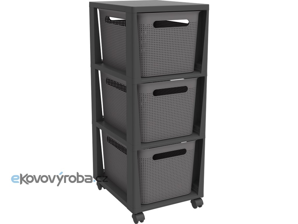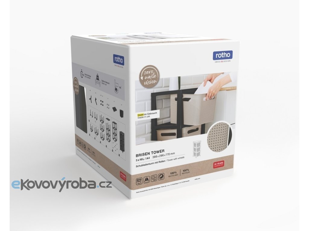 Plastový regál se třemi patry. Tři úložné boxy s děrovanou strukturou z kolekce Brisen. Maximální zatížení je 30kg na celou skříňku, případně maximální zatížení jednoho boxu je 9kg. Boxy jsou ideální pro organizaci věcí jak vpracovně, tak vdětském pokoji či koupelně. Objem boxu je 16L. Kolečka pro jednodušší manipulaci. Moderní a kvalitní provedení od švýcarské značky Rotho. Regál je balený v krabici - jednoduché sestavení.