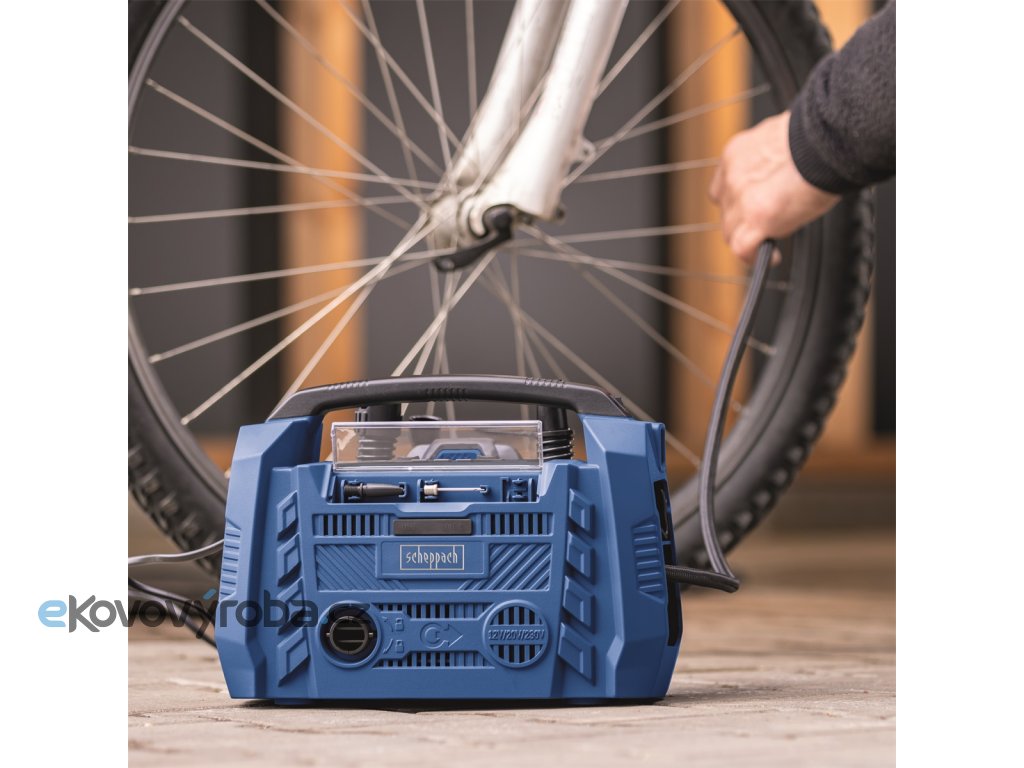Tento hybridní kompresor podporuje napájení z baterie řady Scheppach IXES 20V, standardní elektrické sítě (230 V) nebo autozapalovače (12 V). S pracovním tlakem až 10,3 bar zvládne i náročnější úkoly, přičemž jednoduché ovládání zajišťuje přehledný digitální panel. Díky funkci automatického vypnutí se kompresor vypne, jakmile dosáhne přednastaveného tlaku, což zajišťuje bezpečnost a komfort obsluhy. Možnost volby jednotek tlaku (bar, PSI, kPa) zvyšuje jeho univerzálnost. Praktické funkce zahrnují režim vysokého objemu a nízkého tlaku, ideální například pro rychlé nafukování matrací nebo vyfukování vzduchu při balení.