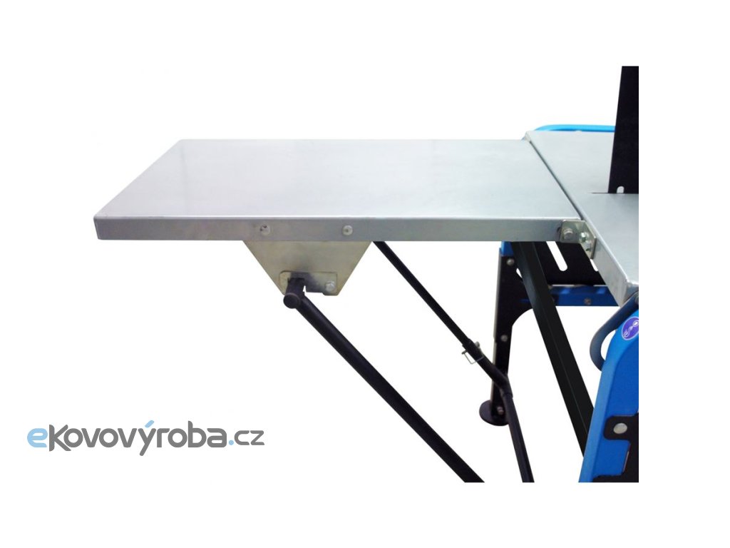 Konstrukce: robustní ocelový rám, velký pracovní stůl (-> rozměry d x š: 1.000 x 760 mm; včetně prodlužovacího stolku 720 x 400 mm), podélný doraz, přípojka odsávání, stojné nohy s výsuvnými patkami (-> k vyrovnání případných nerovností, např. při venkovním použití; max. délka vyložení: 110 mm).