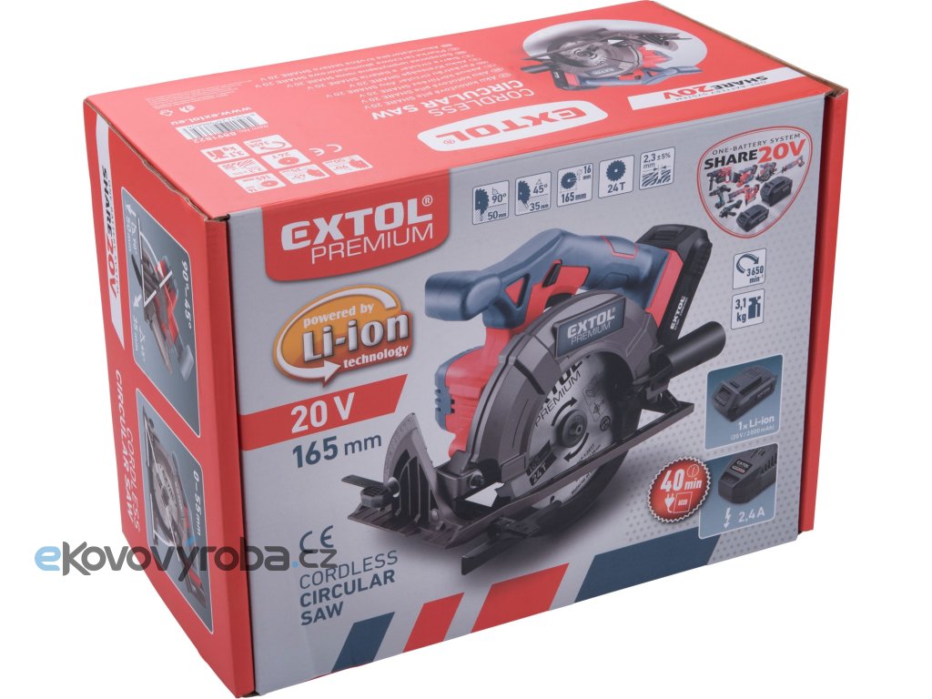 Aku kotoučová pila je navržena tak, aby uživatelům poskytla výkonné a snadné řezání při různých instalatérských, elektrických, rámovacích, dokončovacích a tesařských pracích. Pila je poháněná silným motorem s otáčkami 3650/min, který umožňuje uživatelům rychle a snadno řezat tvrdým materiálem. Horní a spodní kovový ochranný kryt poskytují vynikající ochranu kotouče při pádu. Gumová měkká rukojeť je ergonomicky navržena tak, aby uživatelům poskytovala vynikající pohodlí a vyvážení pro snadno ovladatelné řezy. Pro běžnou práci dostačují jeden nebo dva 2000mAh akumulátory, které můžete rychle nabít v rychlonabíječce, pro náročnější nebo delší práci doporučujeme větší akumulátory s kapacitou 4000–8000mAh. Akumulátor lze použít ve všech typech nářadí řady EXTOL SHARE20V. Díky použité Li-ion technologii je ho možné kdykoliv dobíjet, aniž by se tím snižovala jeho kapacita. Li-ion akumulátor ztrácí energii vlivem samovybíjení velmi pomalu a vydrží dlouho nabitý a připravený k použití.