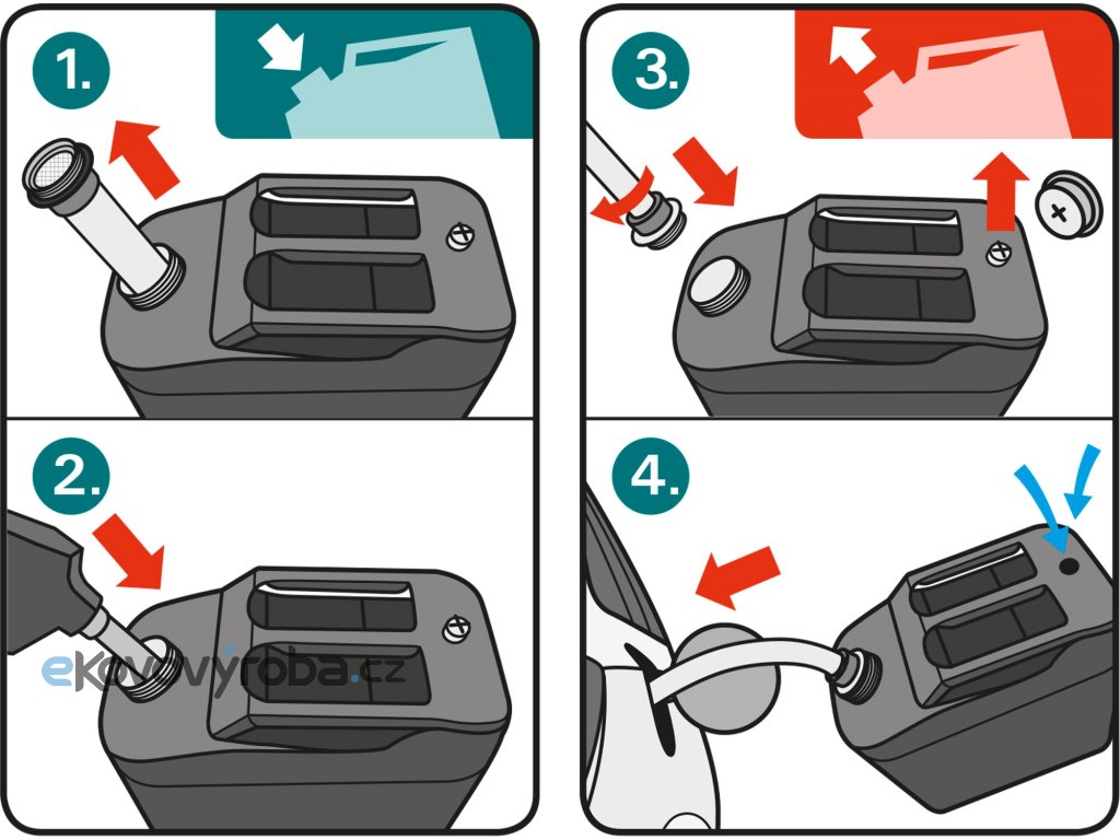 - odvzdušňovací šroub, který je nutno při vylévání tekutin z kanystru vyšroubovat (pro manipulaci s + profilem šroubu lze použít uzávěr kanystru, ve kterém je vylisována matrice s + profilem)