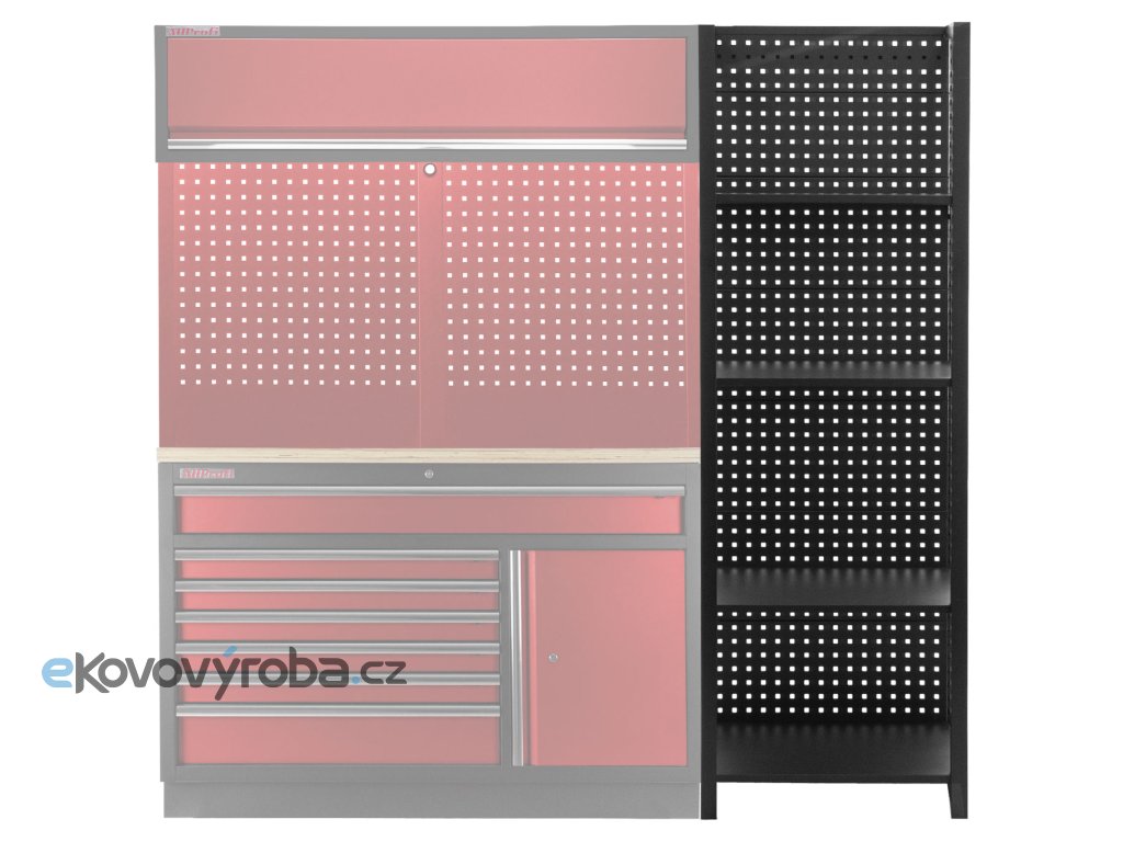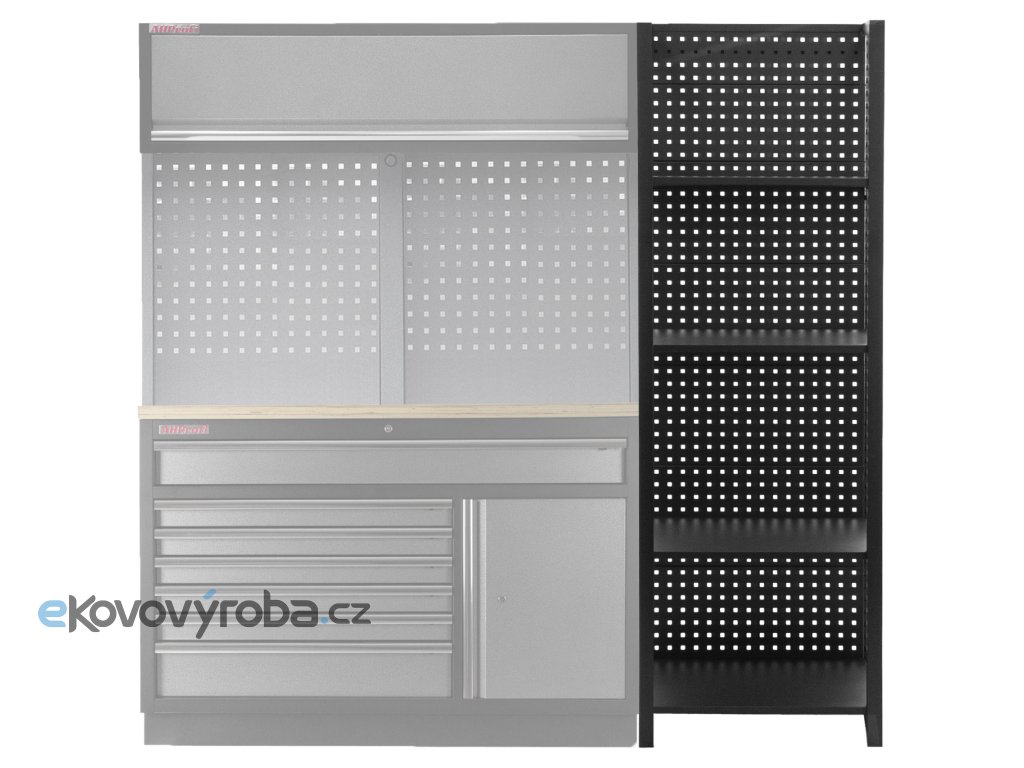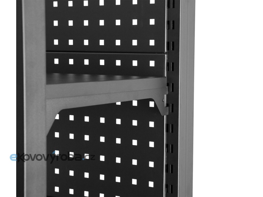 Stabilitu regálu zajišťují dvě bočnice a zadní děrovaná deska, která lze také využít pro zavěšení drobného nářadí pomocí háčků (nářadí a háčky nejsou součástí balení).