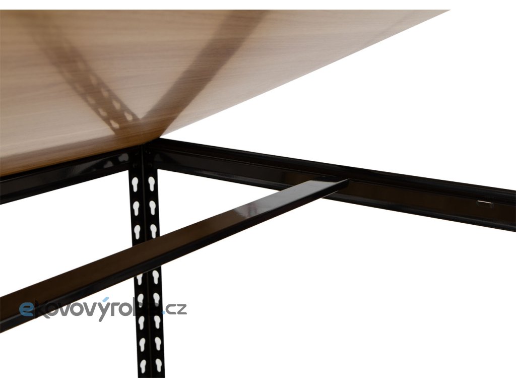 Bezšroubová konstrukce regálu umožňuje snadné a rychlé sestavení bez potřeby nářadí a spojovacího materiálu. Černý design s policemi v lesklém dřevodekoru dodávají regálu elegantní vzhled. Jeho zaoblené hrany zajišťují bezpečnost a dvě centrální podpěry na každé patro poskytují dodatečnou stabilitu.