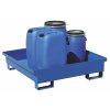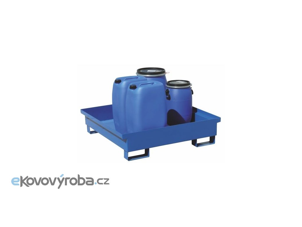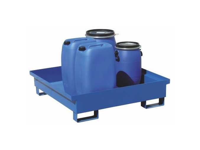Ocelová lakovaná záchytná vana bez roštu. Záchytná vana pro skladování 200 l sudů nebo menších nádob. Vybaveno pro manipulaci VZV technikou. Záchytná vana musí být při manipulaci VZV v prázdném stavu.