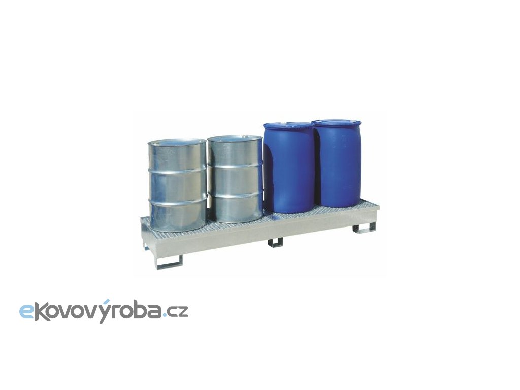 Ocelová žárově zinkovaná záchytná vana s žárově zinkovaným roštěm. Záchytná vana pro skladování 4x 200 l sudů v řadě. Provedení s roštem usnadňuje manipulaci se sudy. Vybaveno kapsami pro manipulaci pomocí VZV techniky. Záchytná vana musí být při manipulaci VZV v prázdném stavu.