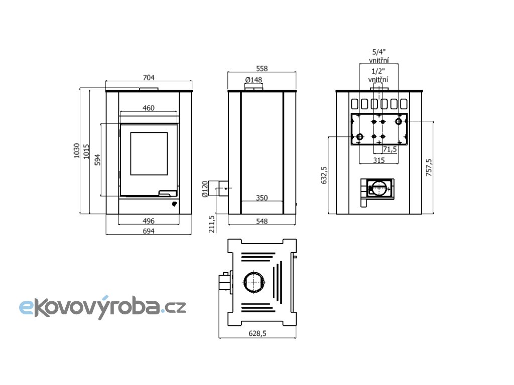 | Materiál | 5mm plech (spalovací komora), 3mm plech (těleso), šamot |