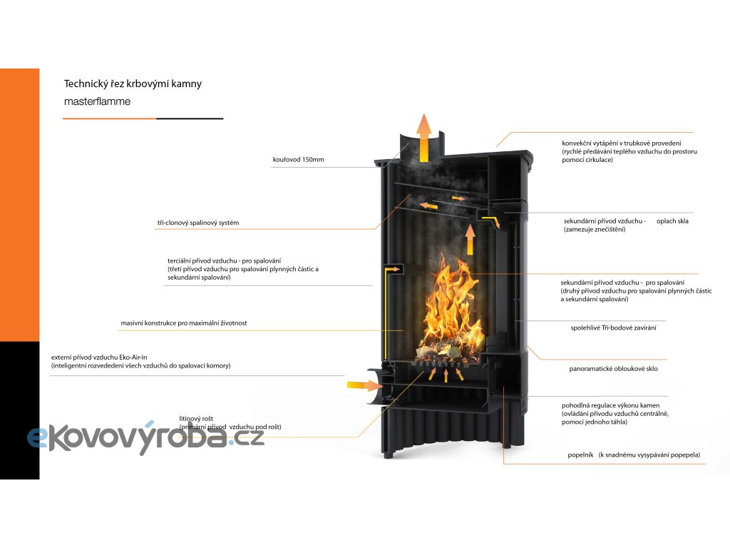 Krbová kamna Masterflamme díky své masivní konstrukci zastupují vysoce kvalitní segment trhu. Trubkové řešení spalovací komory zajišťuje velmi nízkou roztažnost materiálu, vysokou kvalitu a dlouhou životnost celého zařízení. Trubky zaručují maximální předání tepla a velmi rychlé ohřátí vzduchu proudícího v trubkách. Tento princip vytápění zajišťuje rovnoměrné rozdělení teplého vzduchu nejen po místnosti, kde stojí kamna, ale také do dalších místností. Použité materiály pocházejí od největších zpracovatelů železa, kteří zajišťují stálé a kvalitní dodávky. Kamna Masterflamme se mohou také pyšnit splněním nejpřísnějších technických norem, které určují největší výrobní země nejen v Evropě, a v těchto zemích jsou velmi žádaná.