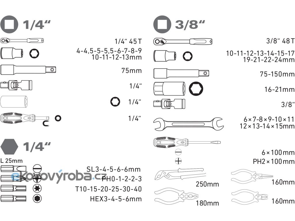 | hlavice nástrčné | 1/4": 4-4,5-5-5,5-6-7-8-9-10-11-12-13mm, 3/8": 10,11,12,13,14,15,17,19,21,22,24mm (CrV) |