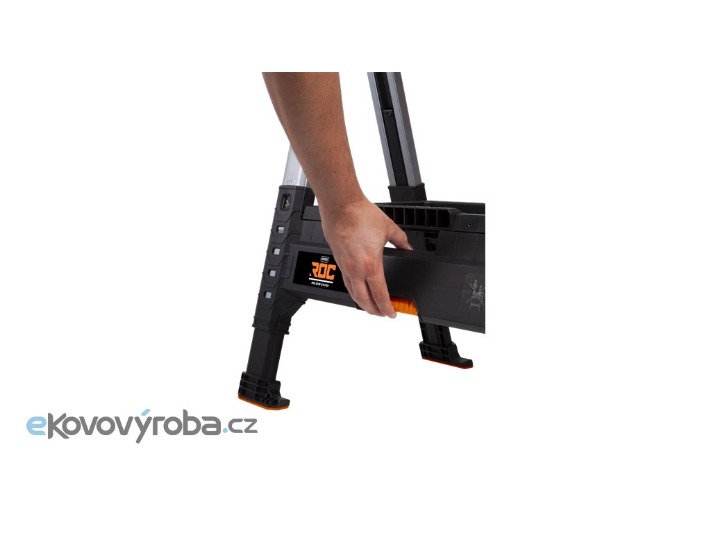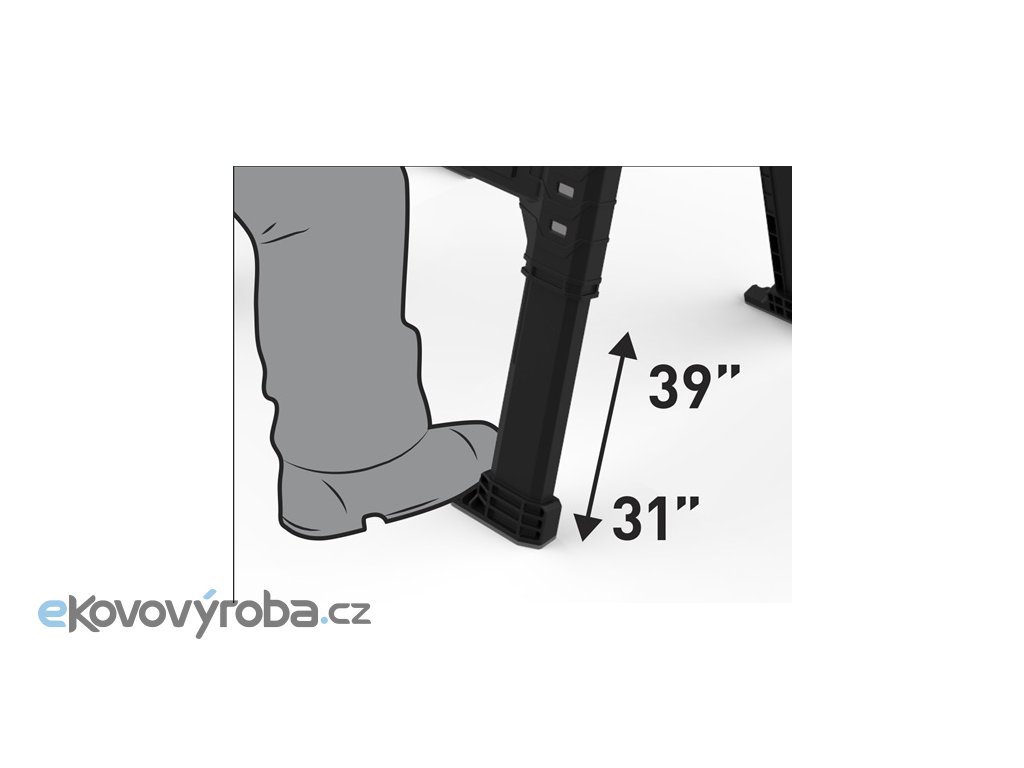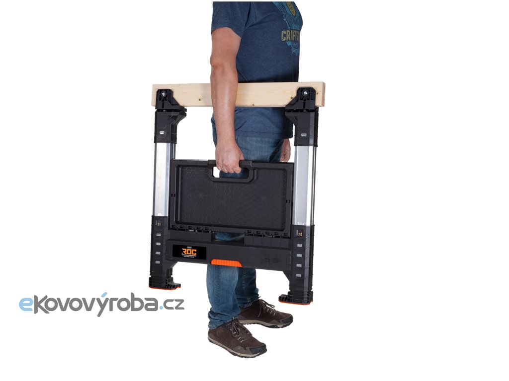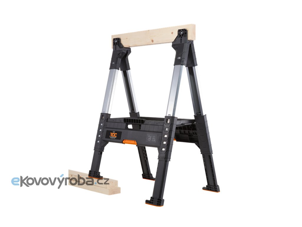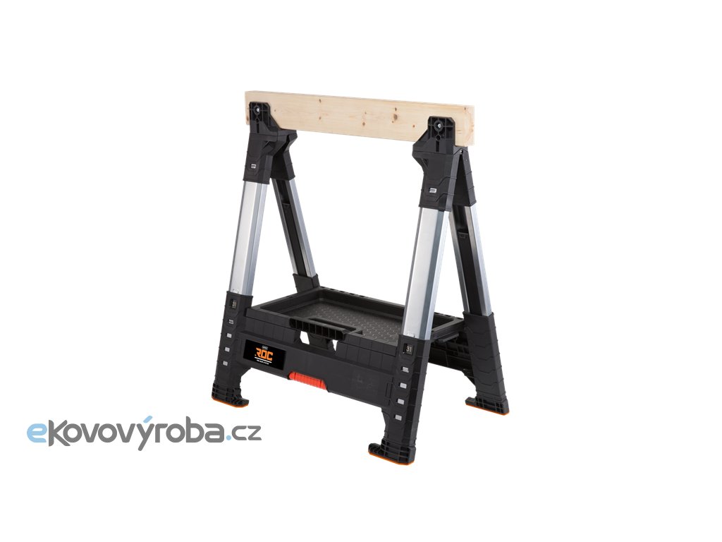 Dílenská koza s upravitelnou výškou 80 až 100 cm. Nohy lze výškově přizpůsobit každou zvlášť. Pro uskladnění lze složit. Součástí balení je dřevěná vzpěra a zásobník na nářadí. Hmotnost 7,2 kg a nosnost 1360 kg.