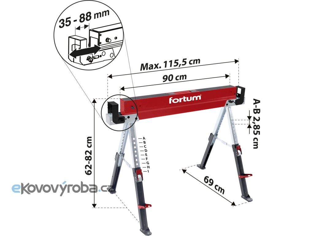 Nastavitelná stavební koza FORTUM je vhodná všude tam, kde potřebujete vytvořit výškově nastavitelnou pracovní plochu nebo stůl. V páru dvě kozy disponují více než dostatečnou nosností až 1180kg (590kg/kus). Na obou koncích je každá koza vybavena bočními