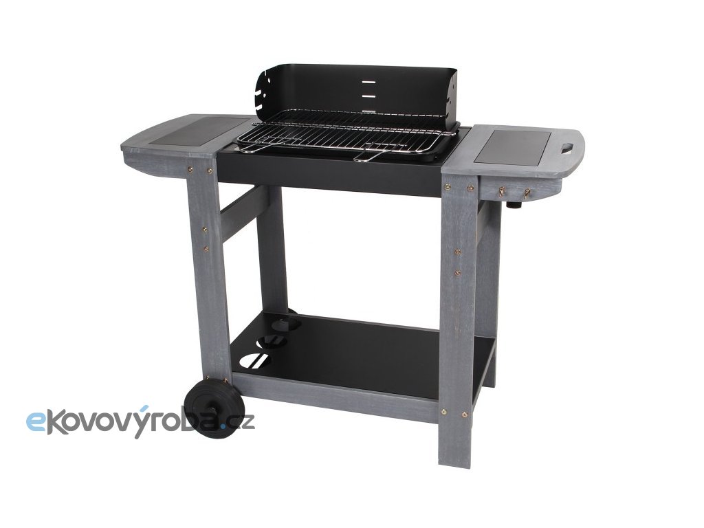 Gril má kolem grilovací plochy silný lakovaný plech, díky kterému se může nastavovat výška chromovaného roštu v několika úrovních.