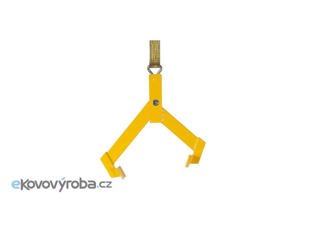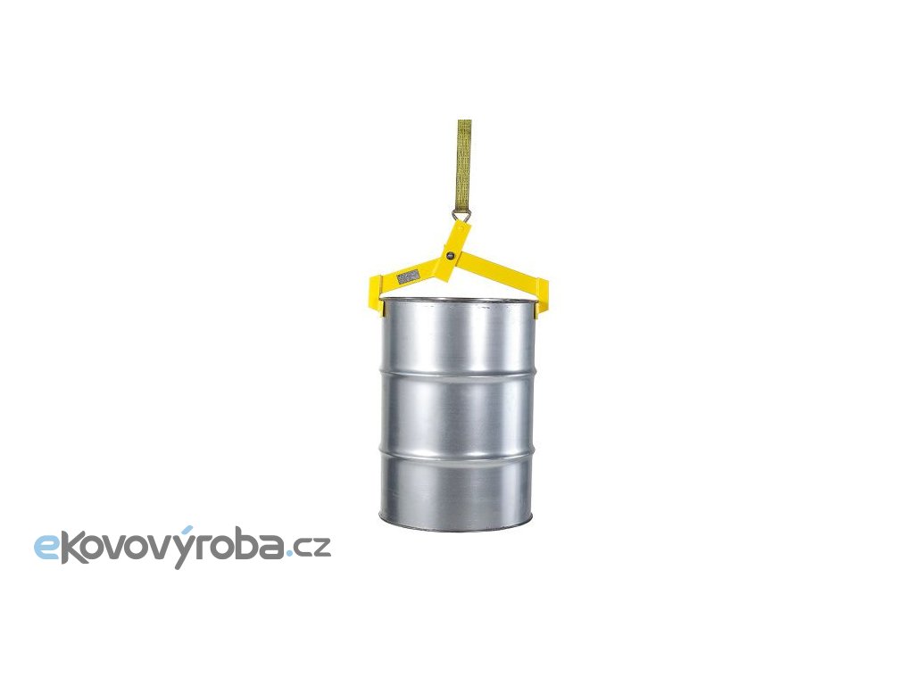 Ocelový závěs sudu ve vertikální pozici. Vyrobeno z oceli / ocelového plechu. Vertikální závěs sudů – složen ze dvou ramen – jedno rameno opatřeno vidlicí se závěsným čepem. Ramena závěsu jsou vzájemně spojena čepem s pouzdrem. Obě ramena jsou opatřena opěrnými čelistmi pro zavěšení a sevření břemene. Spojovací čep a pouzdro jsou povrchově upraveny zinko-chromováním.