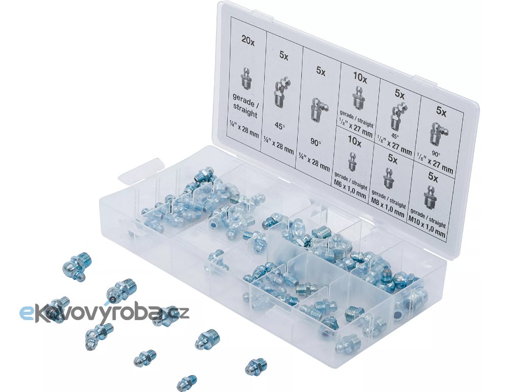 Sada obsahuje 70 kusů mazacích hlavic s metrickým i palcovým závitem.