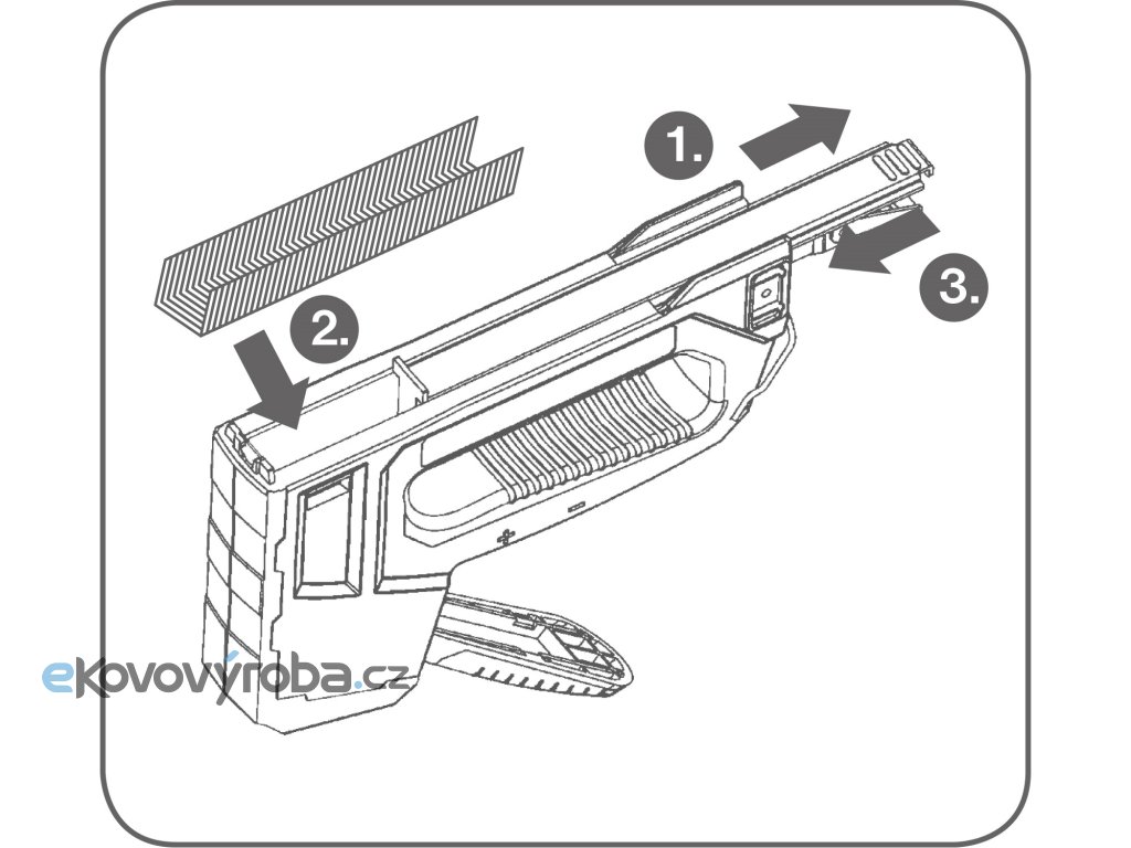 | doplňující parametr | vhodné pro 6 typů spon: výška 6-14mm, rozteč 10,6x tl.1,2mm+ rozteč 10,6x tl.0,75mm+rozteč 11,3x tl.0,75mm, kabelové spony výšky 10-14mm rozteč 7,6mm, hřebíky s hlavičkou i bez hlavičky do max. délky 15mm |