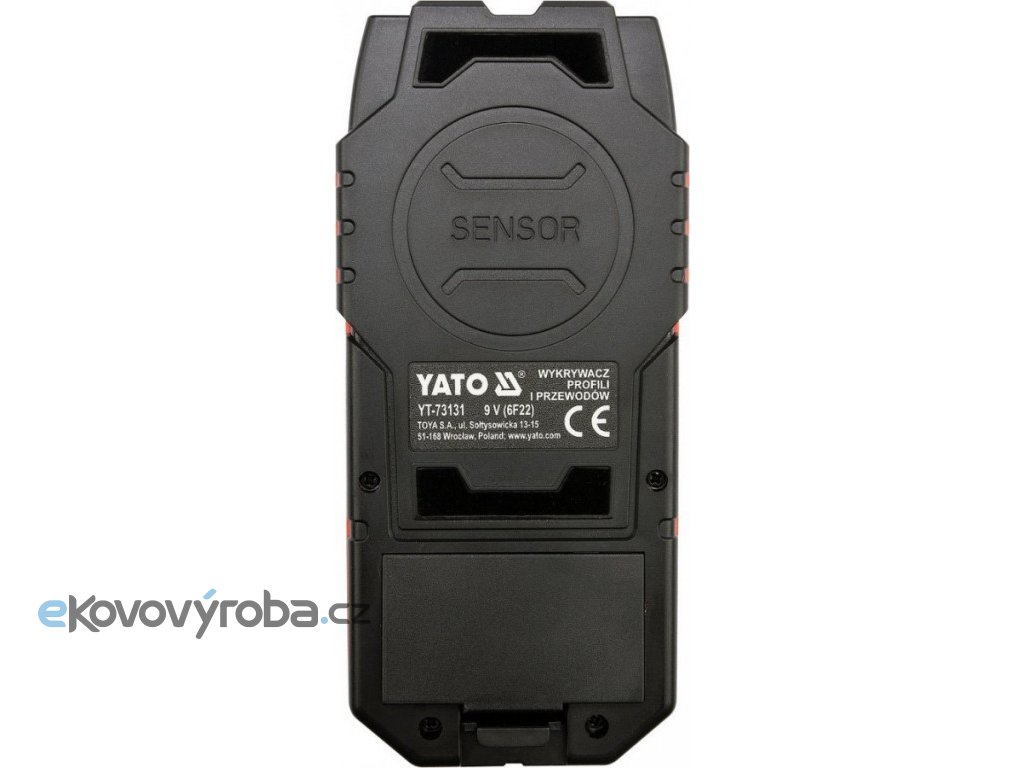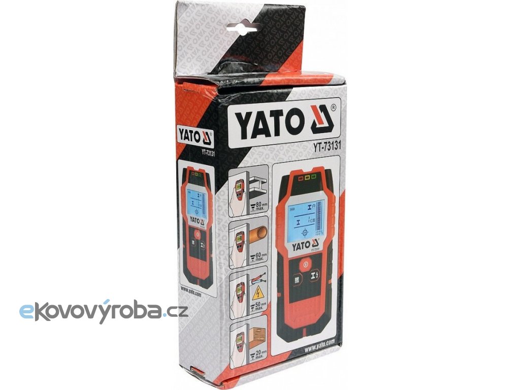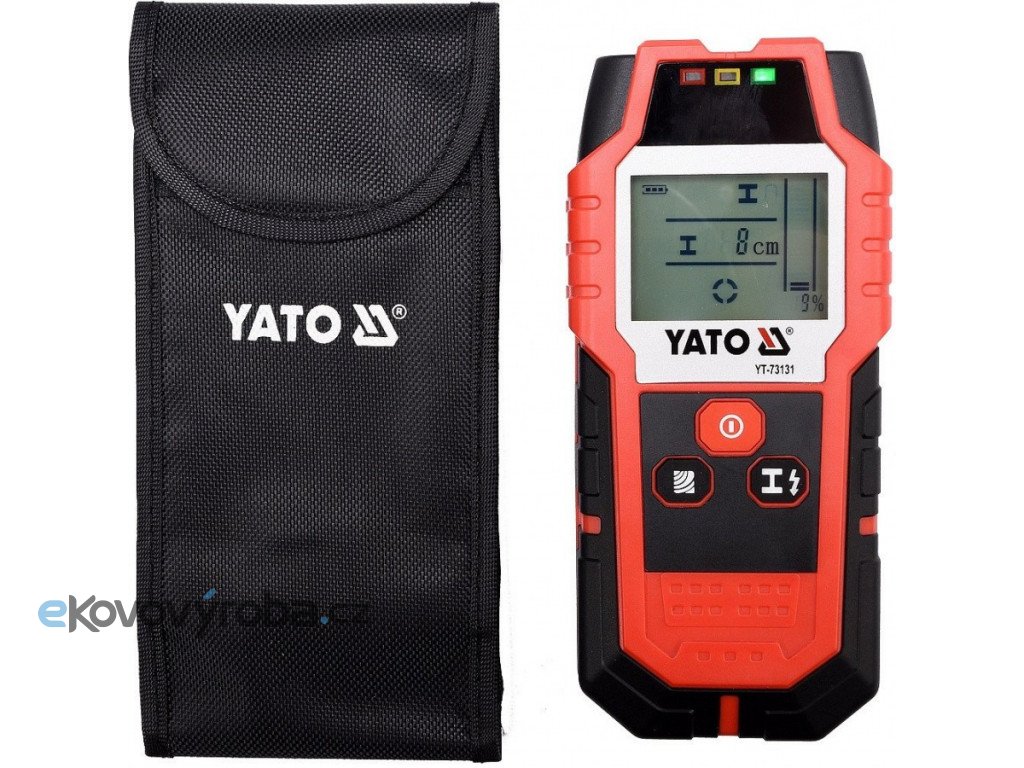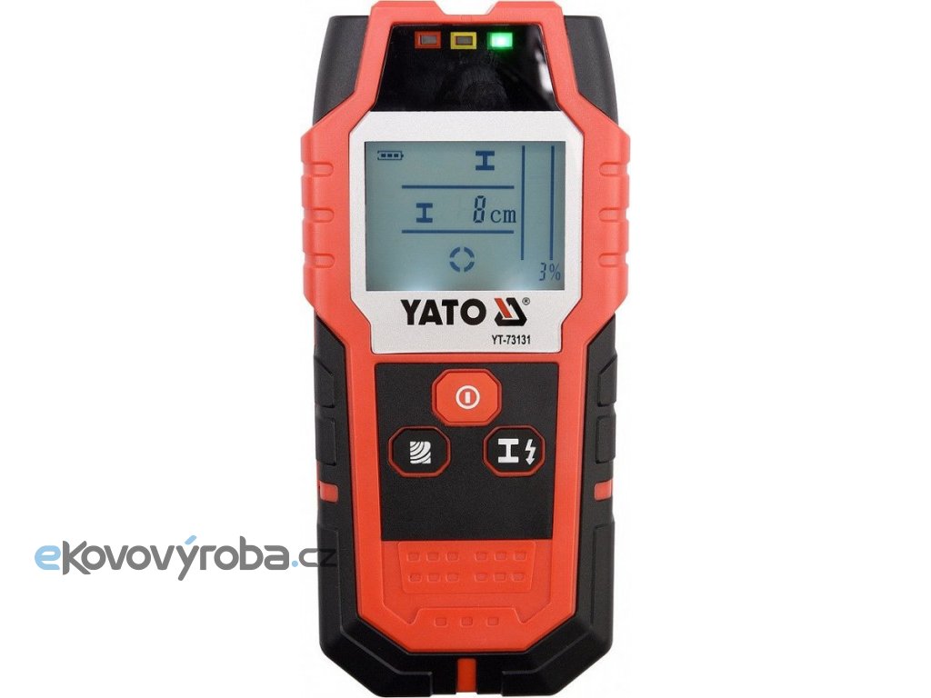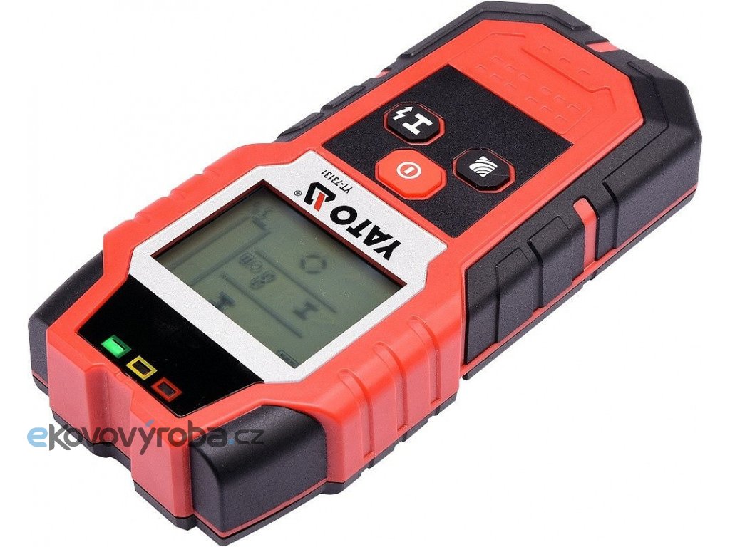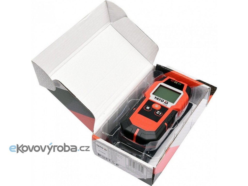 Profesionální digitální detektor Yato-73131 s velkým, čitelným a LED podsvíceným displejem, vhodný na vyhledávání drátů, vodičů, datových kabelů, železných i neželezných profilů.
