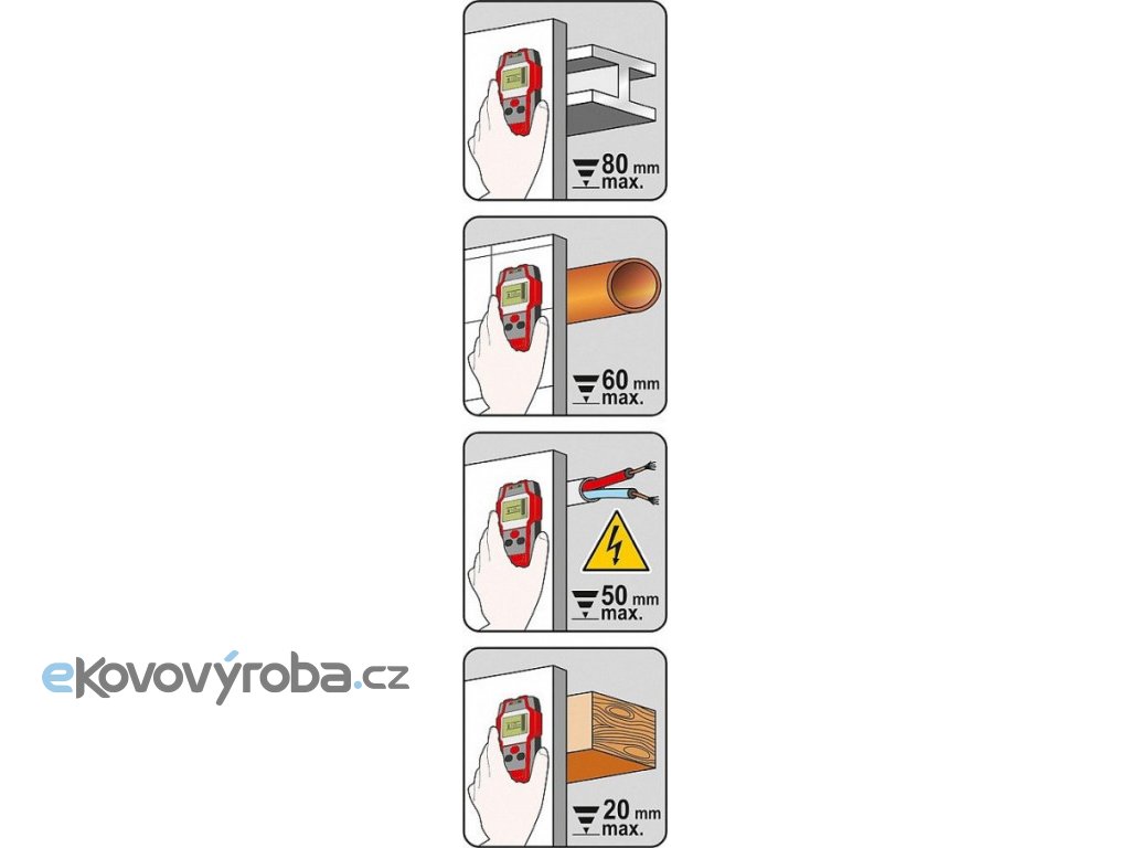 - Zjistitelné objekty: dřevo, kov, vodiče pod napětím.
