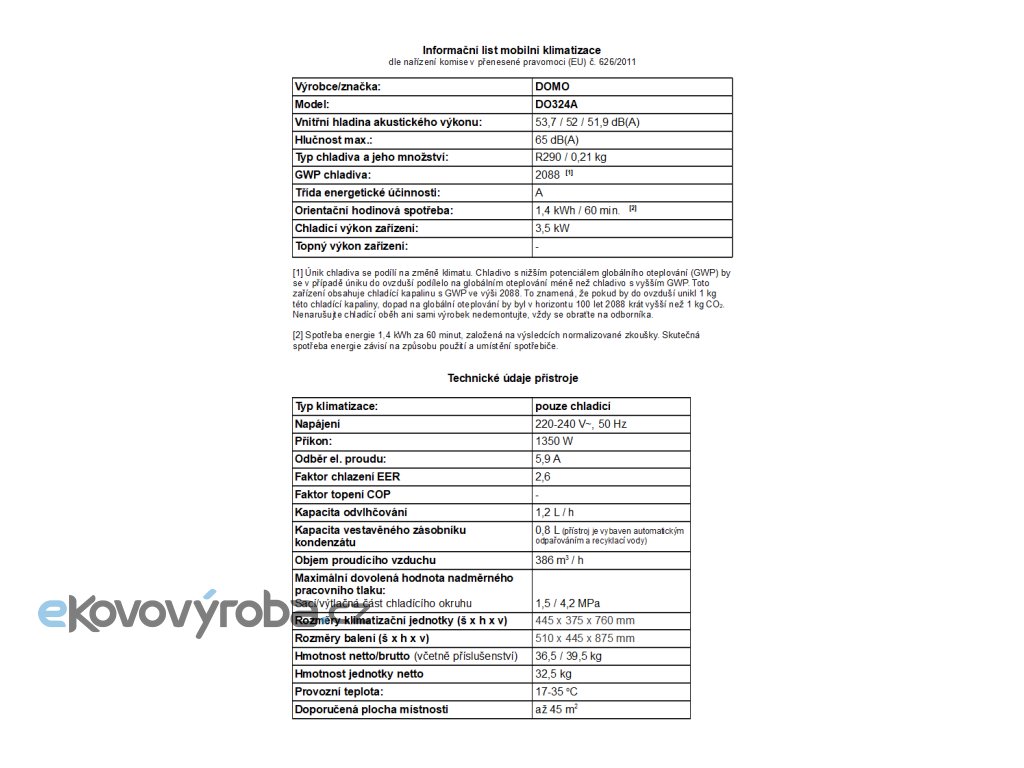 Ekologické chladivo: R290 (0,21 kg)