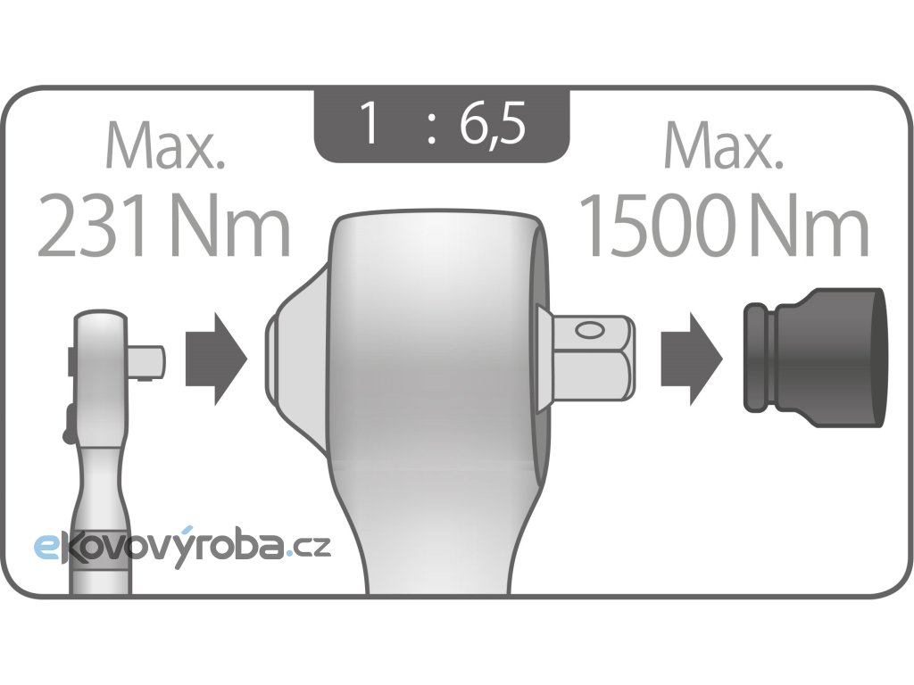 | doplňující parametr | max. výstupní kroutící moment 1500Nm, max. vstupní kroutící moment 231Nm, převodový poměr 1:6,5, vstup 1/2", výstup 3/4", hmotnost sady 6,2kg |