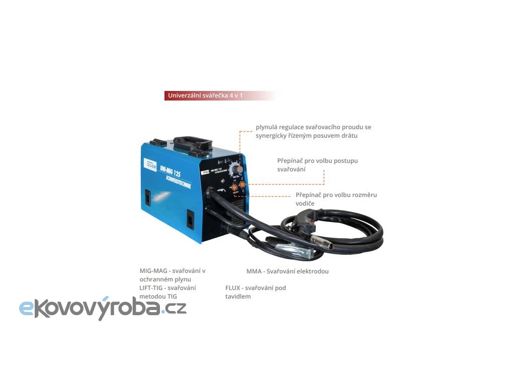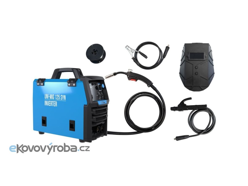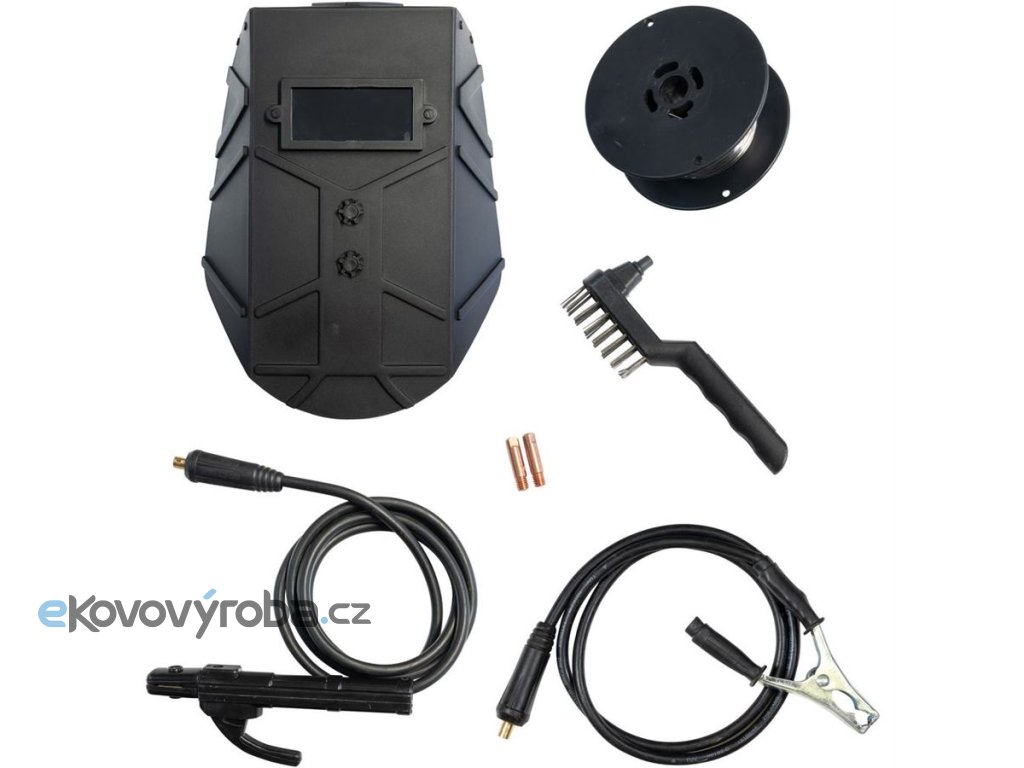 Výrobek obsahuje: 2 m svařovací hořák, kabel s držákem elektrod, zemnící kabel, drátěný kartáč s kladívkem, štít, 3 proudové trysky (0,6-0,8-0,9 mm).