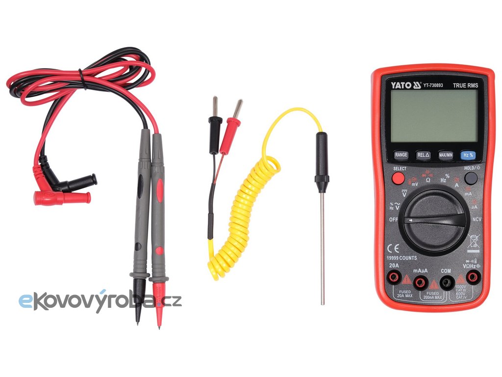 Multimetr YT-730893 s funkcí TRUE RMS a automatickým přepínáním rozsahu pro každé měření. Umožňuje provádět základní i pokročilá měření elektrických veličin. Velký multifunkční LCD displej, řada funkcí usnadňujících měření, rychlost provozu a průmyslová přesnost ocení elektrotechnici, elektrikáři a domácí kutilové. Pouzdro je vybaveno červeným gumovým pouzdrem s vyhrazenými místy pro měřicí sondy, díky čemuž vám měřič snadno nevyklouzne z rukou a minimalizuje riziko poškození v případě pádu. Kabely měřicí sondy mají silikonovou izolaci, jsou flexibilní a odolné vůči vysokým teplotám.