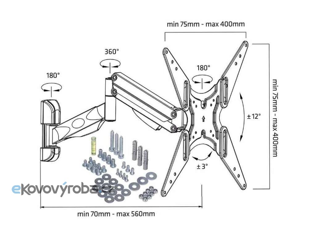 Držák na televize 43" - 65", otočný +90° / -90°, sklopný +12° / -12°, délkové nastavení 70 - 560 mm, výškové polohování 250 mm, korekce roviny +3° / -3°, instalační materiál, výborná kvalita a zpracování, VESA standardy 75x75 až 400x400, na televize a monitory s hmotností 9 - 22 kg