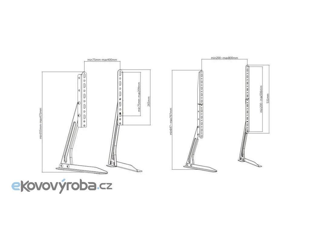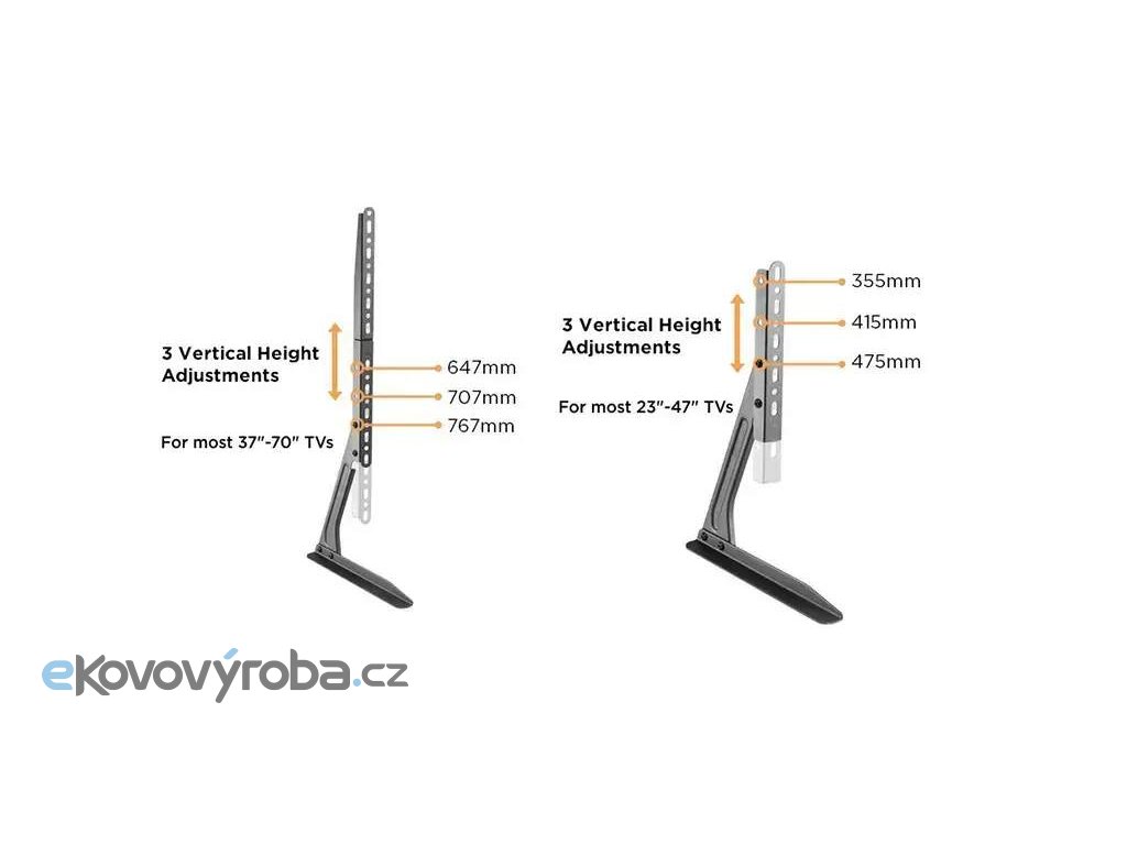 Podstava na Tv i monitory 23" - 70", výška 355 - 767mm, protiskluzové tlumící podložky, instalační materiál, VESA 100x100 až 800x400, nosnost 50kg, záruka 10 let