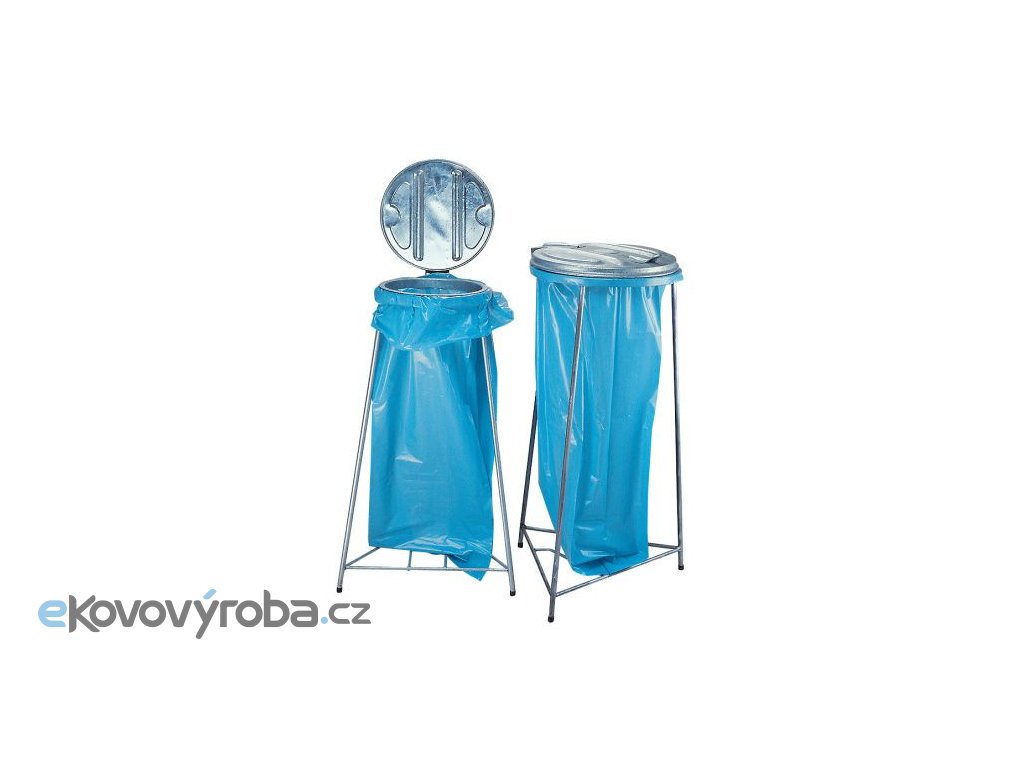 Ocelový stojan pro pytle o objemu 110 l. Vyrobeno z ocelového plechu jakostní třídy 11. Koš je konstruován jako trojnohý rám kuželového tvaru. Nosná část je tvořena třemi svislými stojinami, které jsou spojeny s horní a dolní profilovou obručí. Na horní obruči je pomocí držáku připevněno odklápěcí víko. Uvnitř horního profilu obruče je rozepřena pružná obruč sloužící k upevňování polyetylenových pytlů. Možnost dodání včetně pytle – typ 1077 (700 x 1100 mm).
