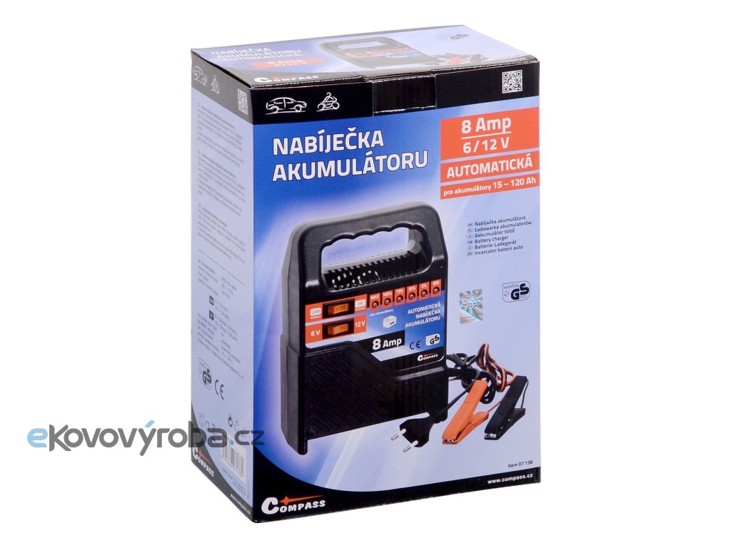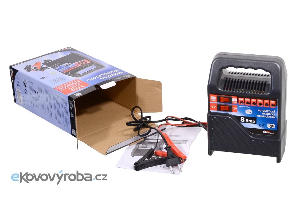 Přenosná automatická nabíječka akumulátoru 6/12V 8A, napájení 230V. Pro akumulátory 6/12V 15-120Ah, max. nabíjecí proud 8A. Baleno v barevné krabici. Homologace GS/TUV