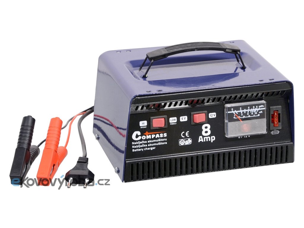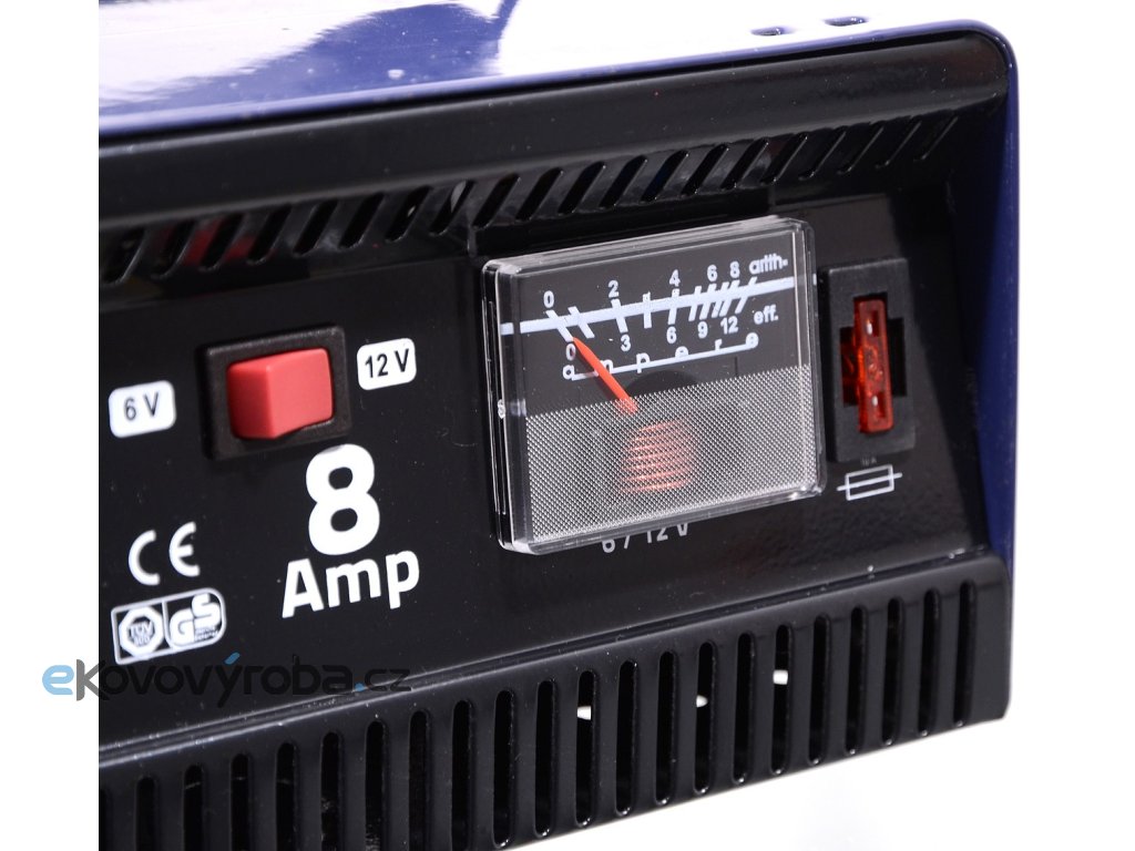 Celokovová automatická nabíječka akumulátorů 6V nebo 12V 8 Amp. Napájení 230V, příkon 84W. Tato nabíječka je určená k nabíjení bezúdržbových olověných akumulátorů o kapacitě 3,7 - 80 Ah. Umožňuje přepnutí nabíjení akumulátoru 6V, nebo 12V a zároveň umožňuje zvolit jednu ze dvou rychlostí nabíjení (šetrné a rychlé). Nabíječka je na čelní straně osazena ampérmetrem ukazujícím aktuální nabíjecí proud a pojistkou.