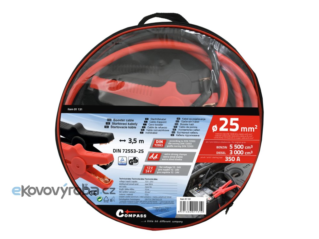 Vysoce kvalitní startovací kabely odpovídají požadavkům evropské normy DIN 72553-25 a jsou způsobilé pro napětí od 12V do 24V. Kabely jsou vyrobeny z mědí potažených hliníkových kabelů, které jsou izolovány a vybaveny kompletně izolovanými kleštěmi pro připojení k akumulátoru.