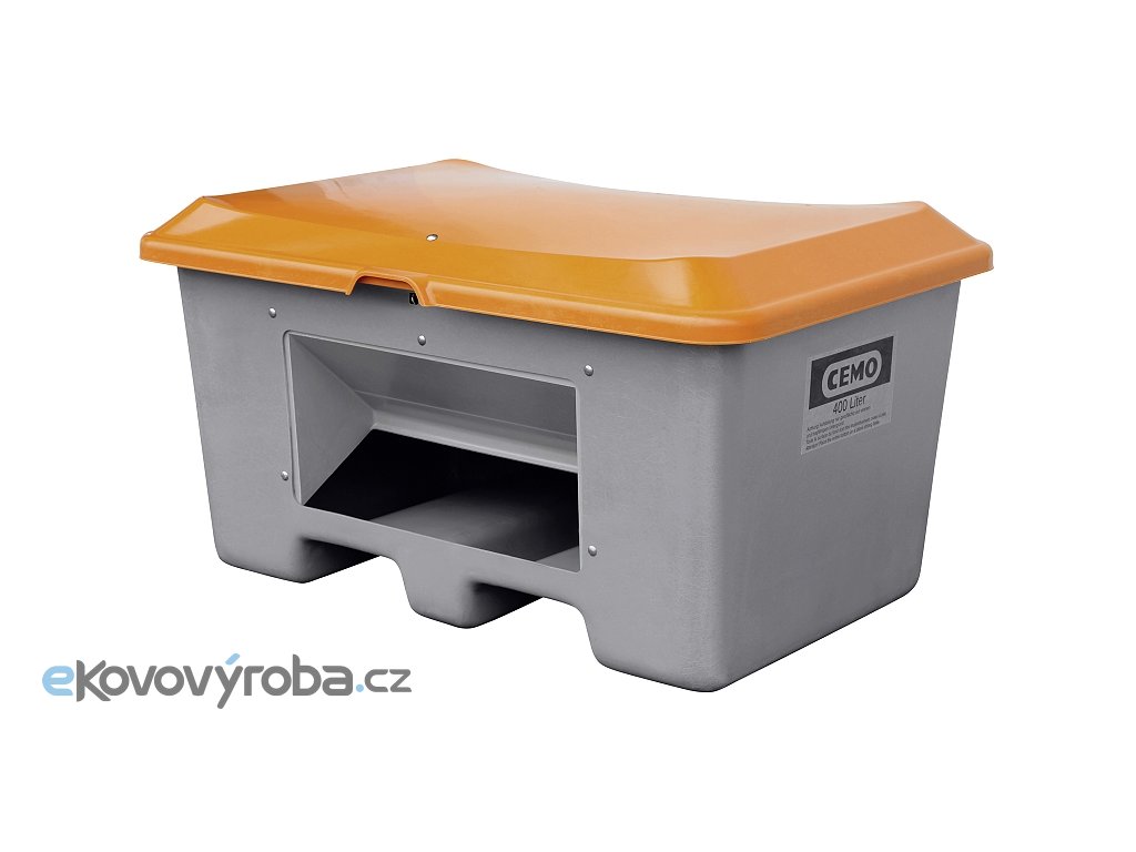 Sklolaminátový zásobník CEMO Plus3 na posypový materiál pro zimní údržbu chodníků a komunikací o objemu 400 litrů se zamykatelným víkem s bočním otvorem a prohlubní pro vedení vidlí vysokozdvižného vozíku. Zásobník je vyroben ze sklolaminátu se zárukou 10 let má zcela hladké vnitřní i vnější stěny, které usnadňují údržbu zásobníku. Tvar zásobníku umožňuje jeho skladování v sobě a tím spoří místo při uskladnění mimo zimní sezonu. Zamykatelné víko se dá odmontovat bez použití nářadí. Barevné provedení oranžové víko, šedý korpus zásobníku.