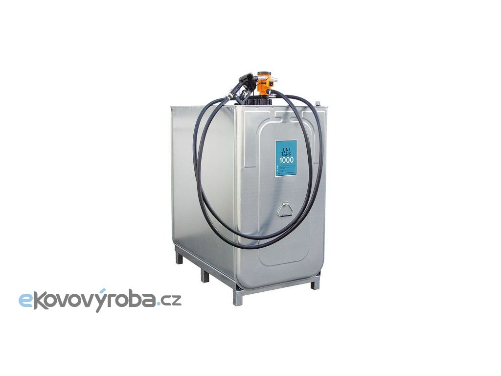 Čerpací stanice UNI s automatickou výdejní pistolí o objemu 1000 l. Nádoba je vyrobena z Polyetylenu. Nádoba je opatřena pláštěm z pozinkovaného plechu-funguje jako záchytná vana. Vybaveno kovovou paletou umožňující manipulaci s paletovým nebo vysokozdvižným vozíkem. Čerpací stanice je certifikována pro umístění v příručních skladech nebo v budovách.