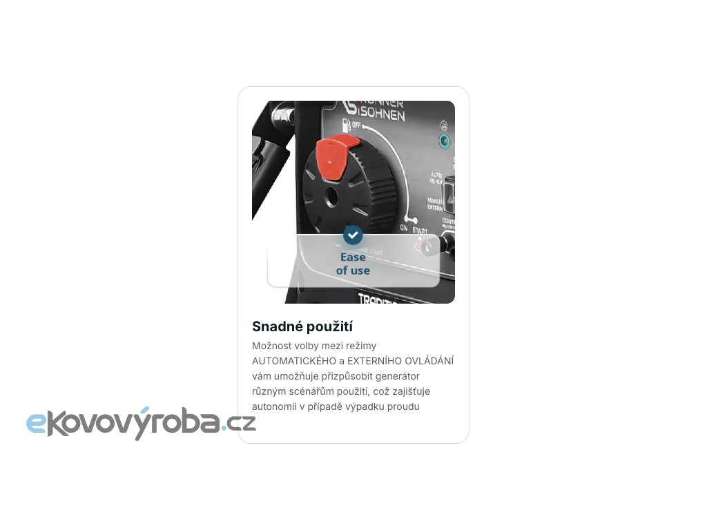 Zařízení je vybaveno ochranou proti přepětí, přetížení, přepólování, zkratu a automatickým vypnutím při nízké hladině oleje. Motor EURO 5 zajišťuje nízkou spotřebu, nízkou hlučnost (70 dB ve 7 m) a dlouhou životnost. Transportní sada (kola + skládací rukojeť) zjednodušuje manipulaci.