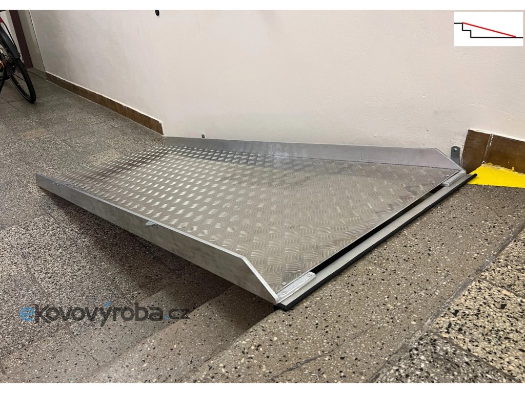 Hliníková univerzální rampa se liší tím, že nekopíruje hrany schodů a tím i úhel, ale je protažena a ve vzduchu. Proto se dá docílit mírnější sklon, avšak jsou použity silnější materiály. Protiskluzový systém a ochrana ostrých hran. Šířku a délku rampy vám upravíme zdarma na míru. Manipulace s rampou je velmi snadná a bez problémů ji zvládne každá maminka, ale i předškolák. Možno je také dokoupit uzamykatelnou petlici. Rampu je také možné nechat volně a případně ji odnášet do kumbálu.