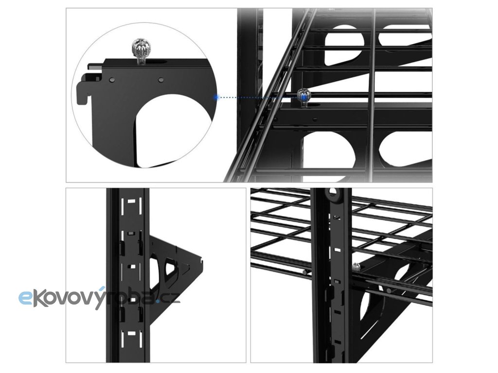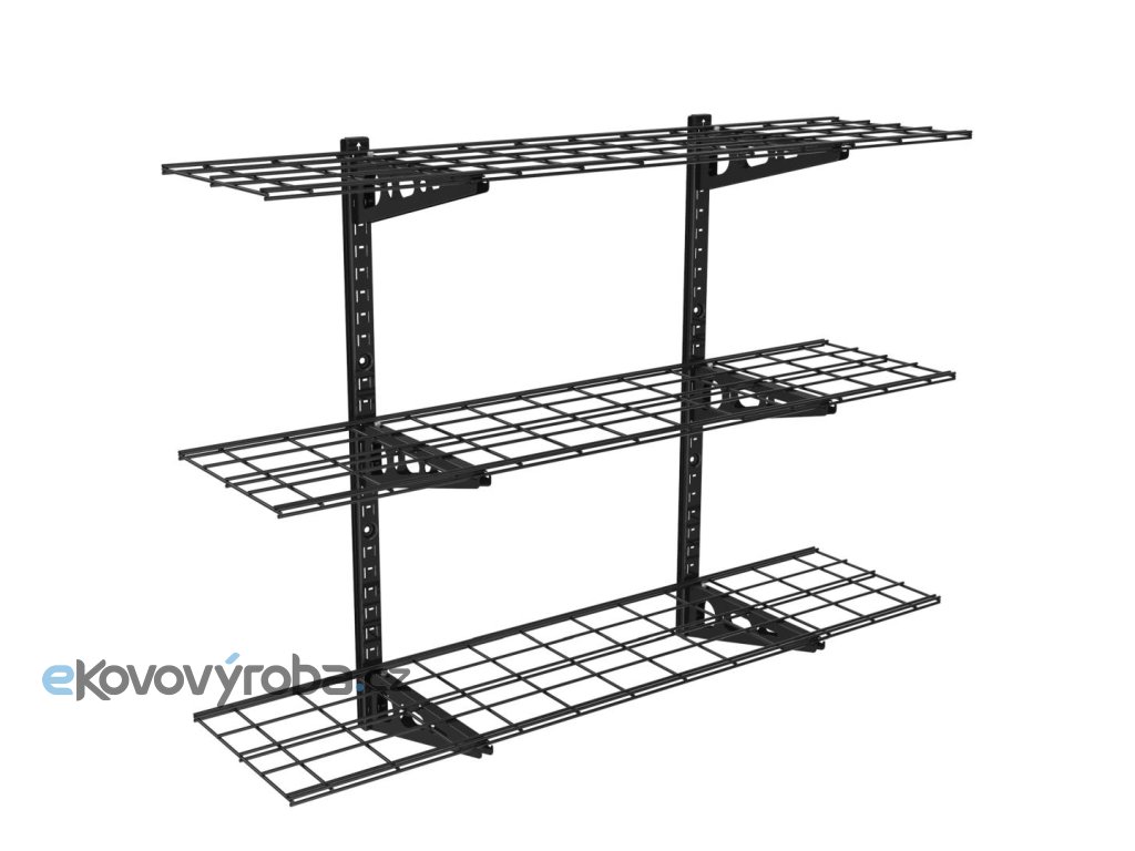 Vynikající trojpolice do garáže, dílny, sklepa, provozovny, skladu nebo kamkoliv potřebujete přidat úložné nebo skladovací prostory. Každá police má nosnost 45kg, celková nosnost 135kg. Rozměr každé z polic je 1220 x 305 mm, délka závěsných lišt je 906 mm. Barevné provedení černé, záruka 5 let. Velmi snadná a rychlá instalace.