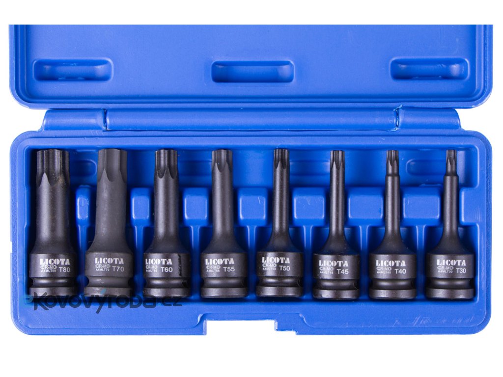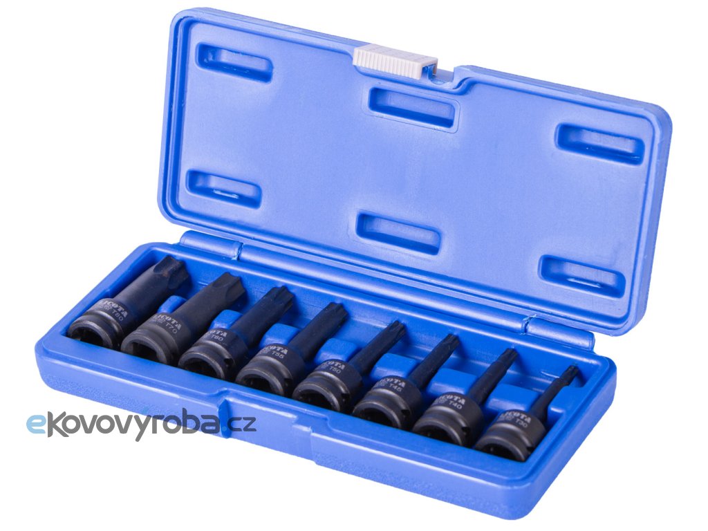 Obsahuje 8 velikostí (T30-T80) přizpůsobených pro 1/2" rázové utahováky, což zajišťuje široké možnosti použití.