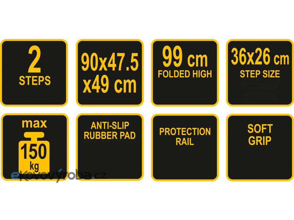 Schůdky s nosností 150kg opatřené protiskluznými nášlapy umožňující sebejisté a stabilní použití.