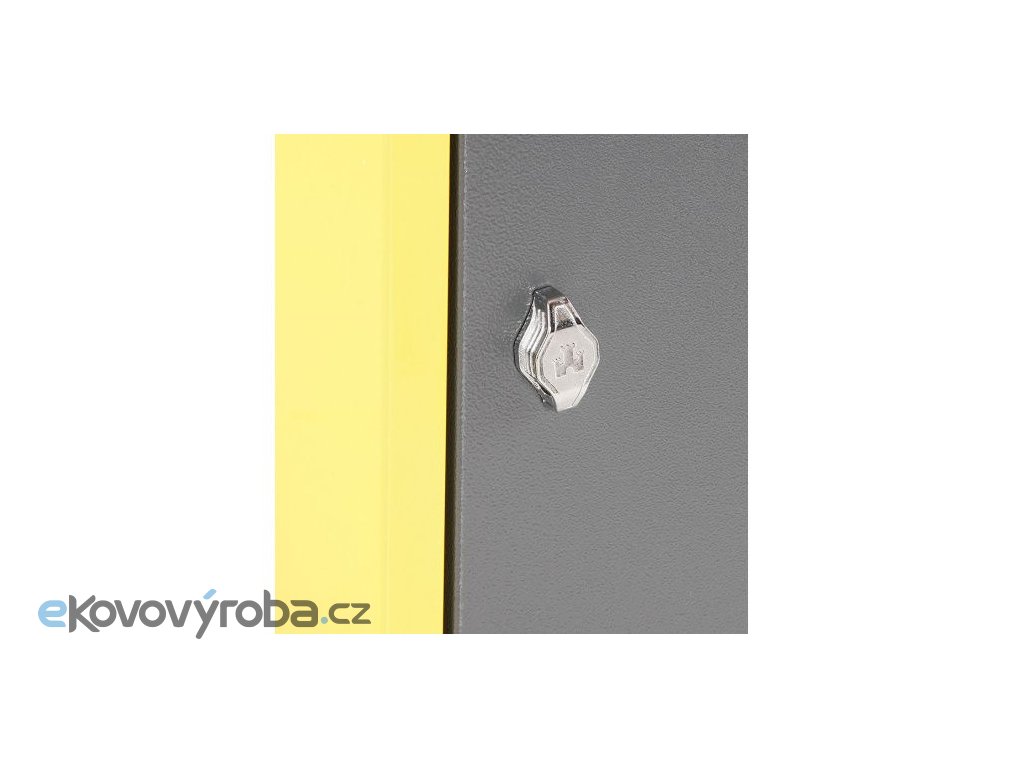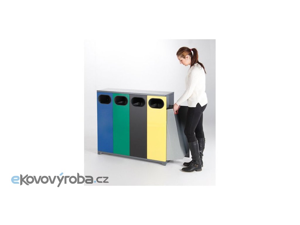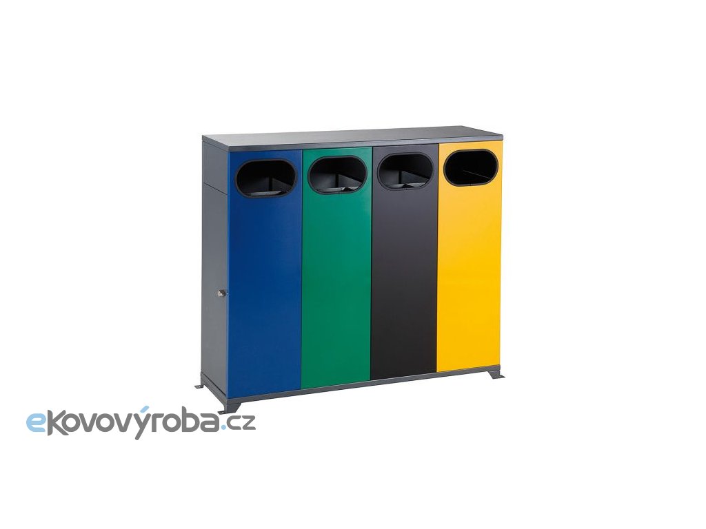 Exteriérový čtyř-koš na tříděný odpad - tloušťka materiálu 2 mm. Vyrobeno z kvalitního pozinkovaného plechu. Vyráběno z materiálů s tloušťkou 1 mm jako interiérové a s tloušťkou 2 mm jako exteriérové provedení. Vybaveno vyjímatelnými vložkami z pozinkovaného plechu o objemu 40 l. Vložky jsou vyjímatelné bočními dvířky opatřenými zámkem. Koš je vybaven bočními dvířky se zámkem na obou stranách. Vhozy jsou opatřeny bezpečnostní gumou. Povrchová úprava vyhotovena práškovou barvou.