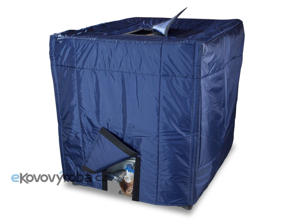Izolační plášť s víkem pro převlečení na IBC kontejner o objemu 1000 litrů s otvory pro plnění nebo odběr kapalin. Modrý