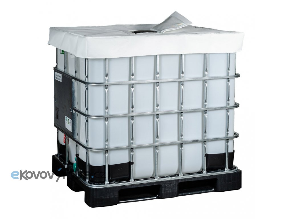Izolační víko na IBC kontejner o objemu 1000 litrů. Kryt je vyroben z materiálu vhodného pro potravinářský i farmaceutický průmysl a je vyplněn izolační vrstvou ze skelného vlákna o celkové tloušťce 6 mm.