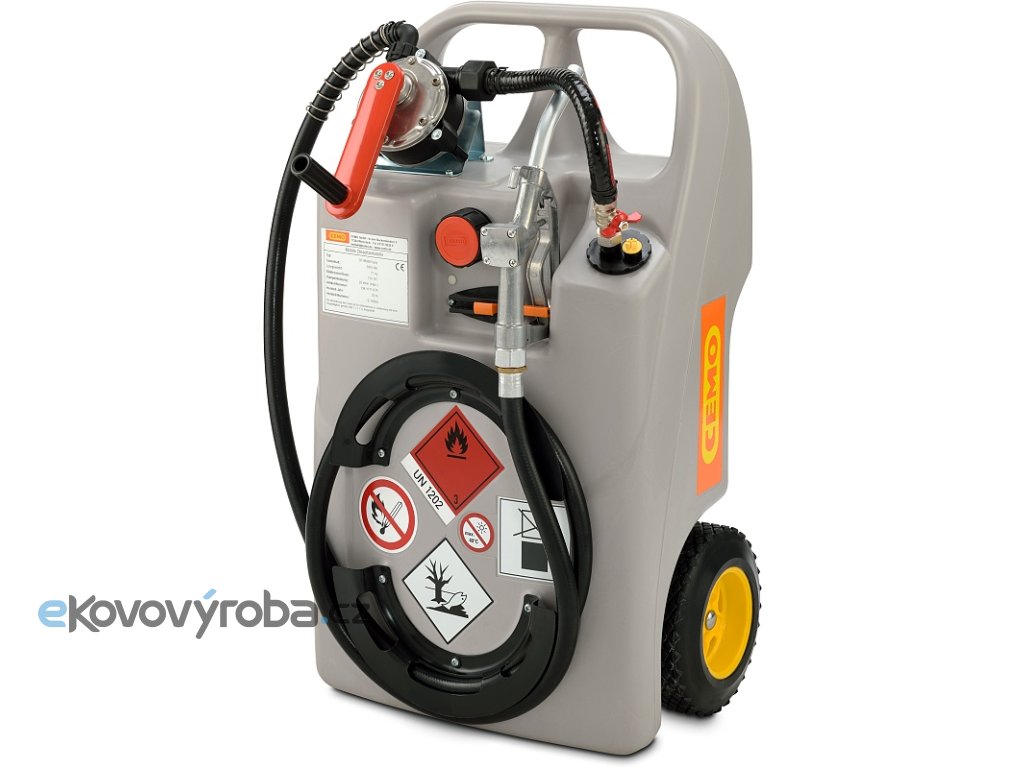 Naftový vozík 100 l, s ručním čerpadlem a čerpací pistolí. Vozík je schválen k přepravě podle ADR 1.1.3.1 c). Na vozíku je lůžko pro výdejní pistoli se zajišťovacím kolíkem, držák výdejní hadice a šroubovací plnící otvor s vyrovnávacím ventilem tlaku. Vozík má dušová kola o průměru 300 mm. Rozměry: 100 x 59 x 43 cm