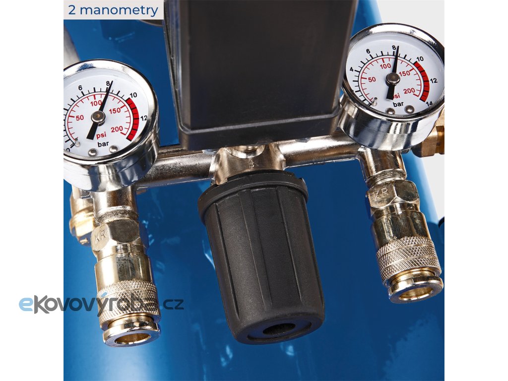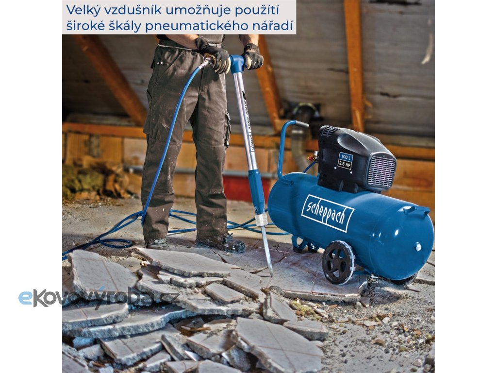 Pro snadnou výměnu nástrojů jsou oba výstupy opatřeny rychlospojkami. O rychlé natlakování nádoby a vysoký sací výkon 412 l/min. se stará výkonná dvouválcová jednotka o výkonu 3 PS. Ta je mazána olejem, což spolu s dvouválcovou technologií dává záruku velmi dlouhé životnosti. Snadnou manipulaci se strojem zajišťuje velké madlo a vzduchem plněné pneumatiky.