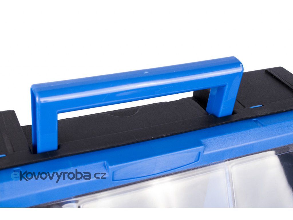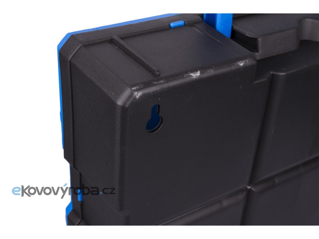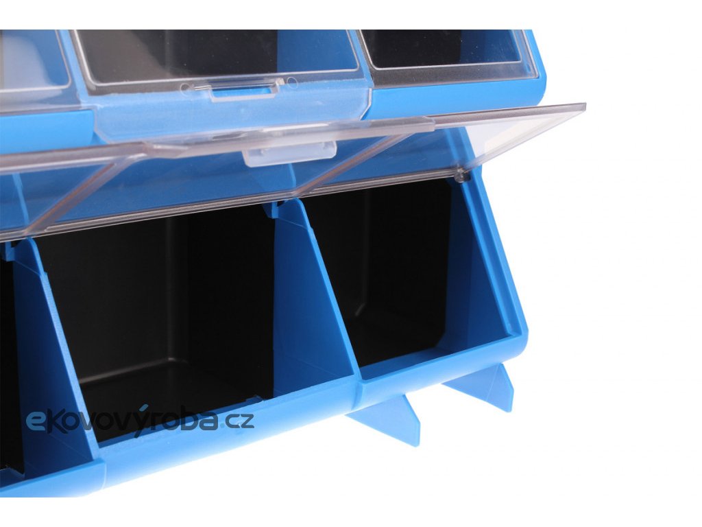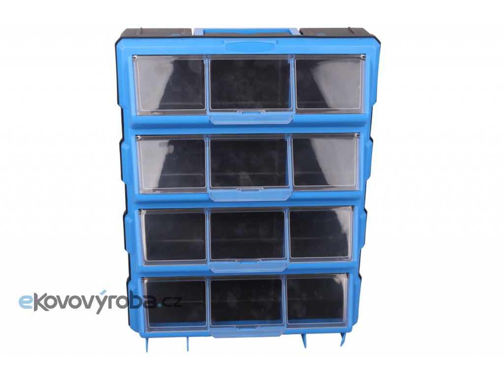Plastový organizér s 12 zásuvkami lze jednoduše zavěsit na zeď, nebo např. z boku skříně, dílenského vozíku apod. Je možné ho postavit na ponk, nebo pracovní stůl a slouží pro uložení montážního materiálu a drobného dílenského vybavení.