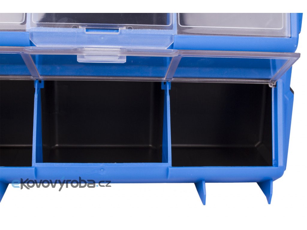 Plastový box obsahuje 12 malých zásuvek o rozměru 100 x 100 x 120 mm.