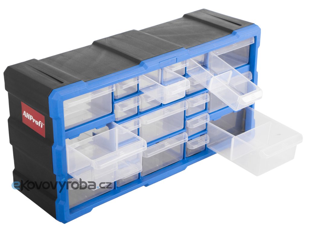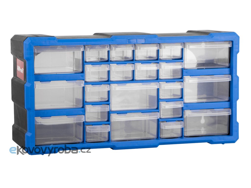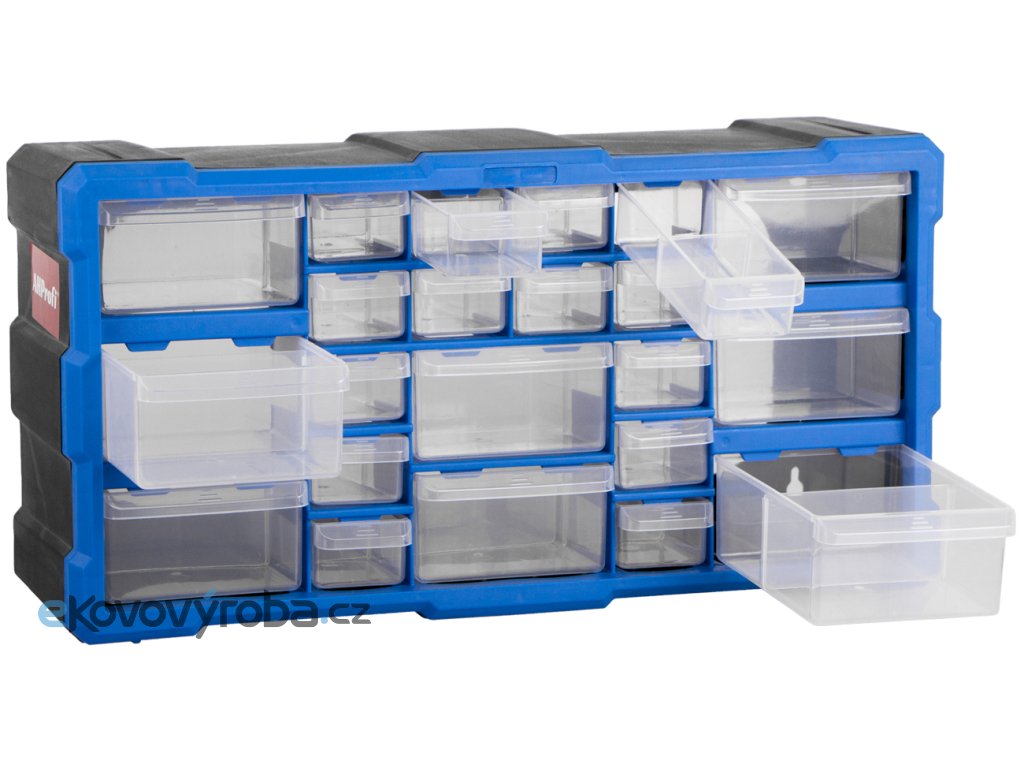Plastový organizér s 22 zásuvkami lze jednoduše zavěsit na zeď, nebo např. z boku skříně, dílenského vozíku apod. Je možné ho postavit na ponk, nebo pracovní stůl a slouží pro uložení montážního materiálu a drobného dílenského vybavení.