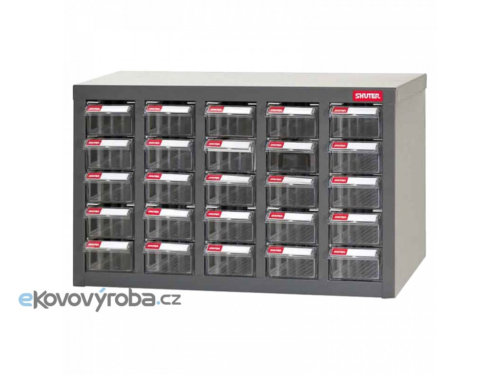 - Galvanizovaný kovový organizér pro uložení montážního materiálu a nářadí s 25 zásuvkami. Rozměry: 586 x 350 x 222 mm (Š x V x H).