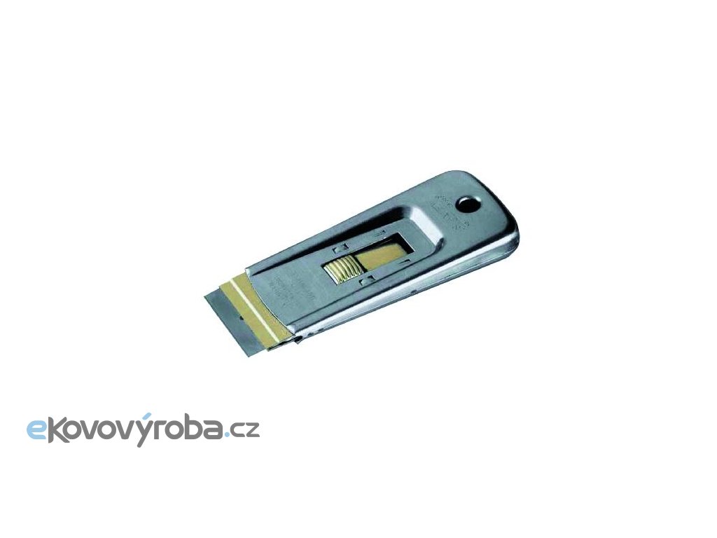 Kovová škrabka na sklo má kovové tělo a mosazný posuvný jezdec sloužící k vysouvání/zasouvání čepele.