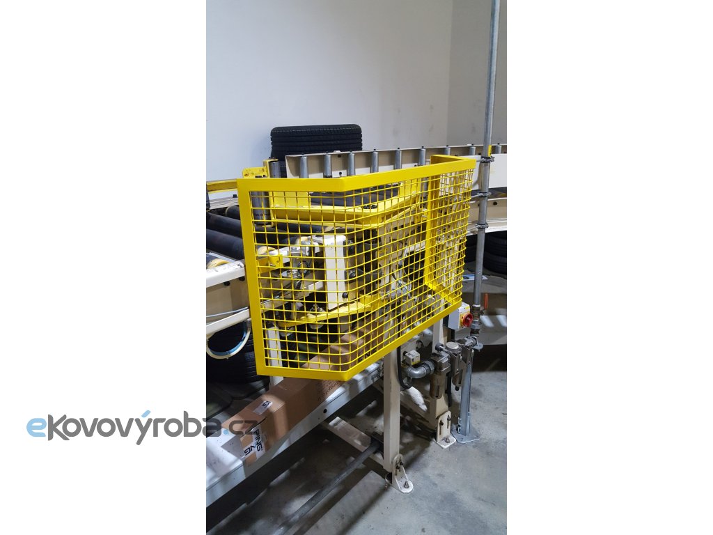 Mříž je vyrobena z oceli a povrchově upravena práškovým lakem v bezpečnostní žluté barvě pro vysokou viditelnost. Stabilní rámová konstrukce zajišťuje odolnost vůči vibracím i nárazům. Vhodná pro montáž na nové i stávající dopravníky, stroje, robotická pracoviště apod.